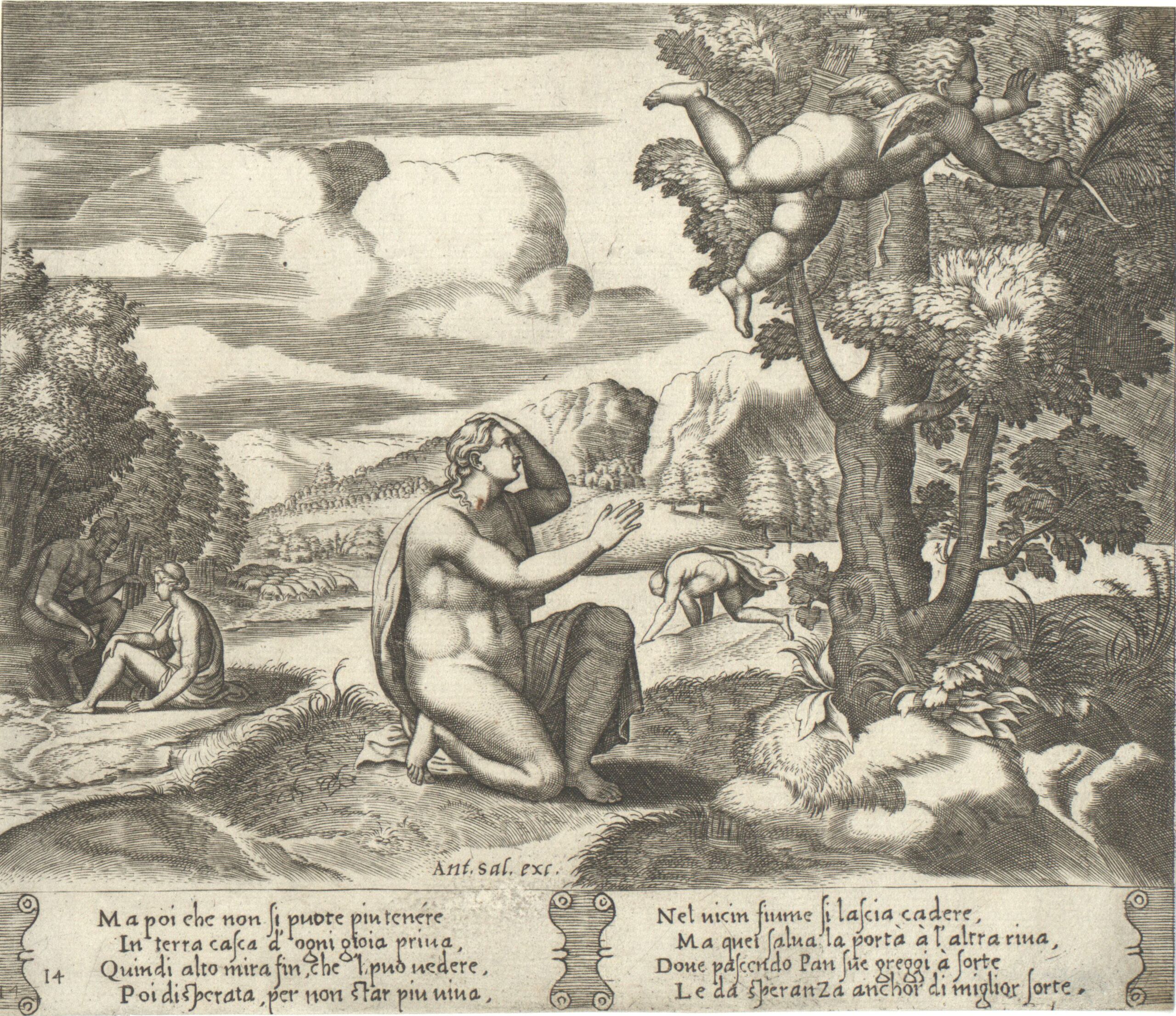 - Amor flieht vor Psyche, Blatt 14 aus der Folge der Fabel der Psyche, Abdruck der von Franc. Villamena überarbeiteten Platten, herausgegeben von A. Salamanca; nach Vasari soll Michiel Coxcie die Vorlagen für die Stiche angefertigt haben (given title)