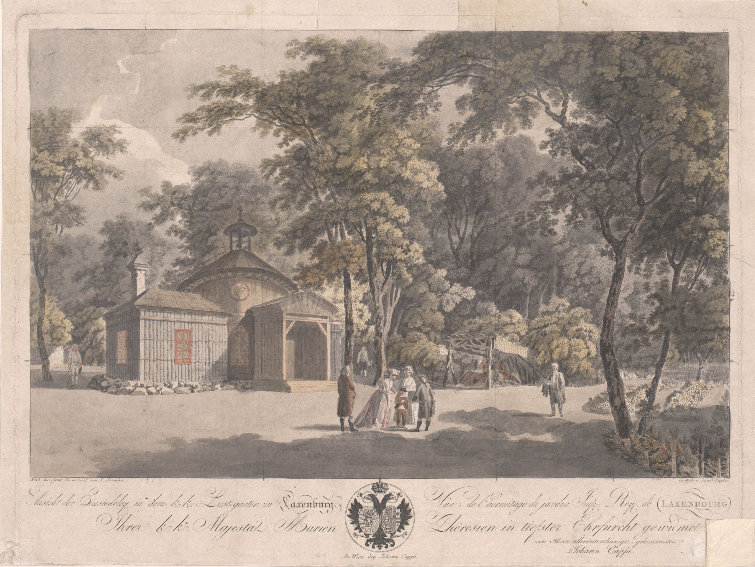 - „Ansicht der Einsiedeley in dem k.k. Lust= garten zu Laxenburg“, Blatt 10 aus einer Folge von Ansichten aus Wien und Niederösterreich („Sammlung von Aussichten der Residenzstadt Wien und ihren Vorstädten und einigen umliegenden Oertern“ etc.), herausgegeben von Johann Cappi (given title)