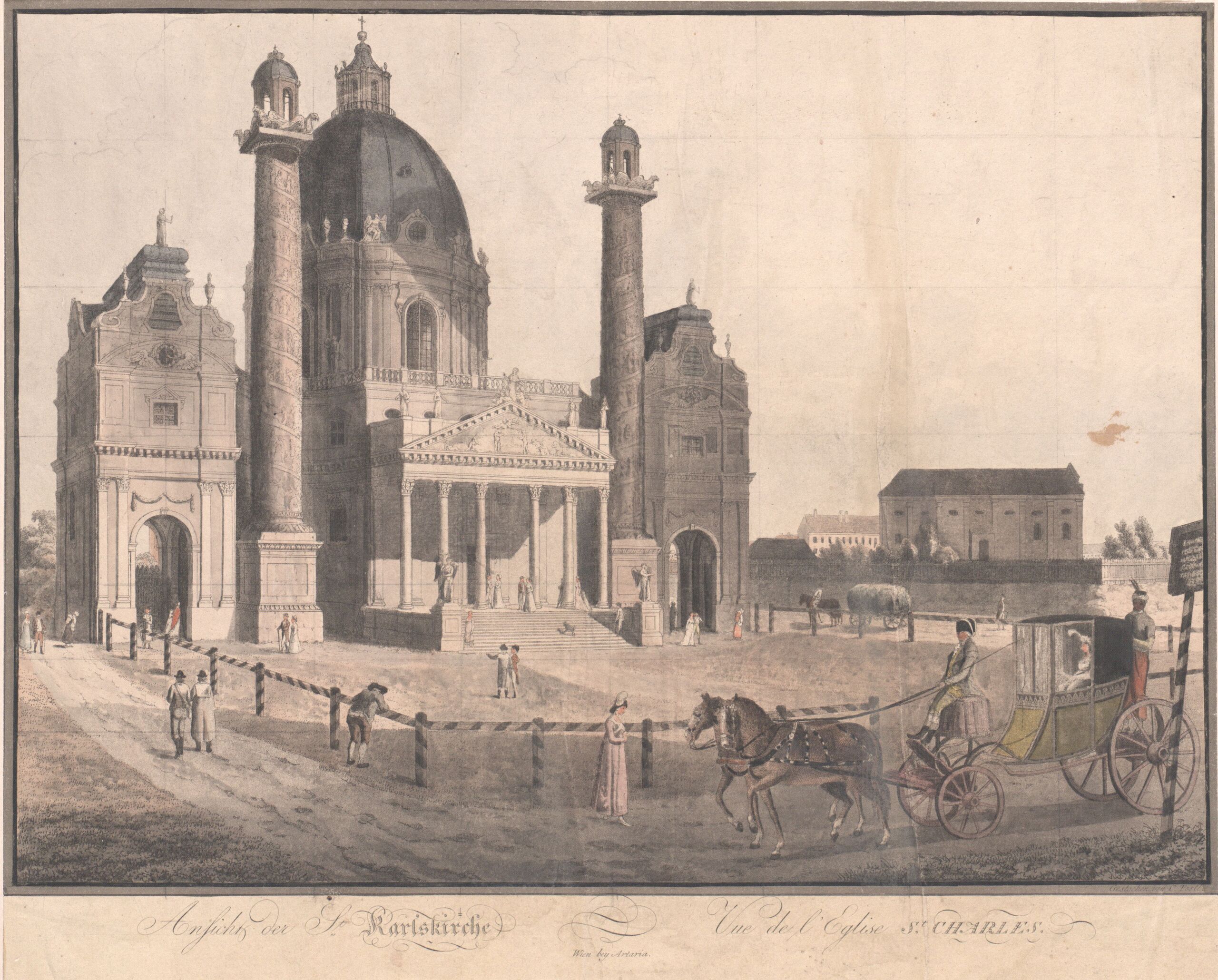 - „Ansicht der St. Karlskirche“, Blatt aus einer Folge von Ansichten aus Wien und Niederösterreich („Sammlung von Aussichten der Residenzstadt Wien und ihren Vorstädten und einigen umliegenden Oertern“ etc.), herausgegeben von Artaria & Comp. (given title)