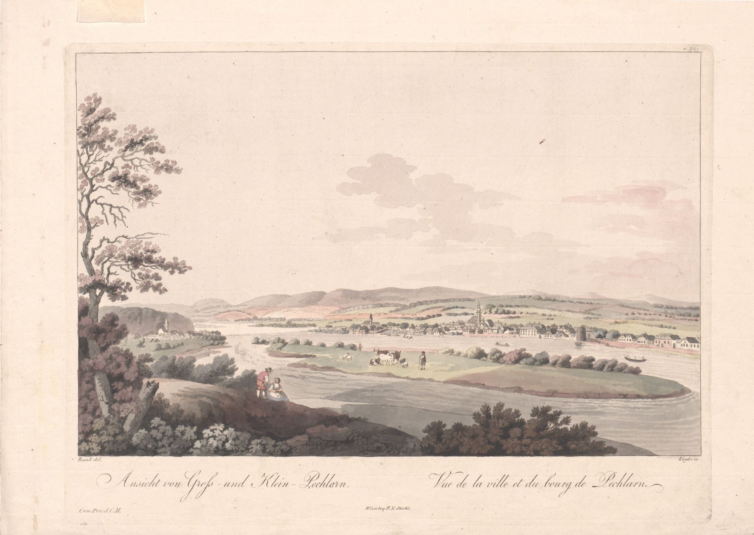 - 作品に記載されている文章: Ansicht vom Gross- und Klein- Pechlarn. / Vue de la ville et du bourg de Pechlarn / Runk del., J. Ziegler sc. / Wien, bey F X Stöckl / Cum Priv. S.C.M.