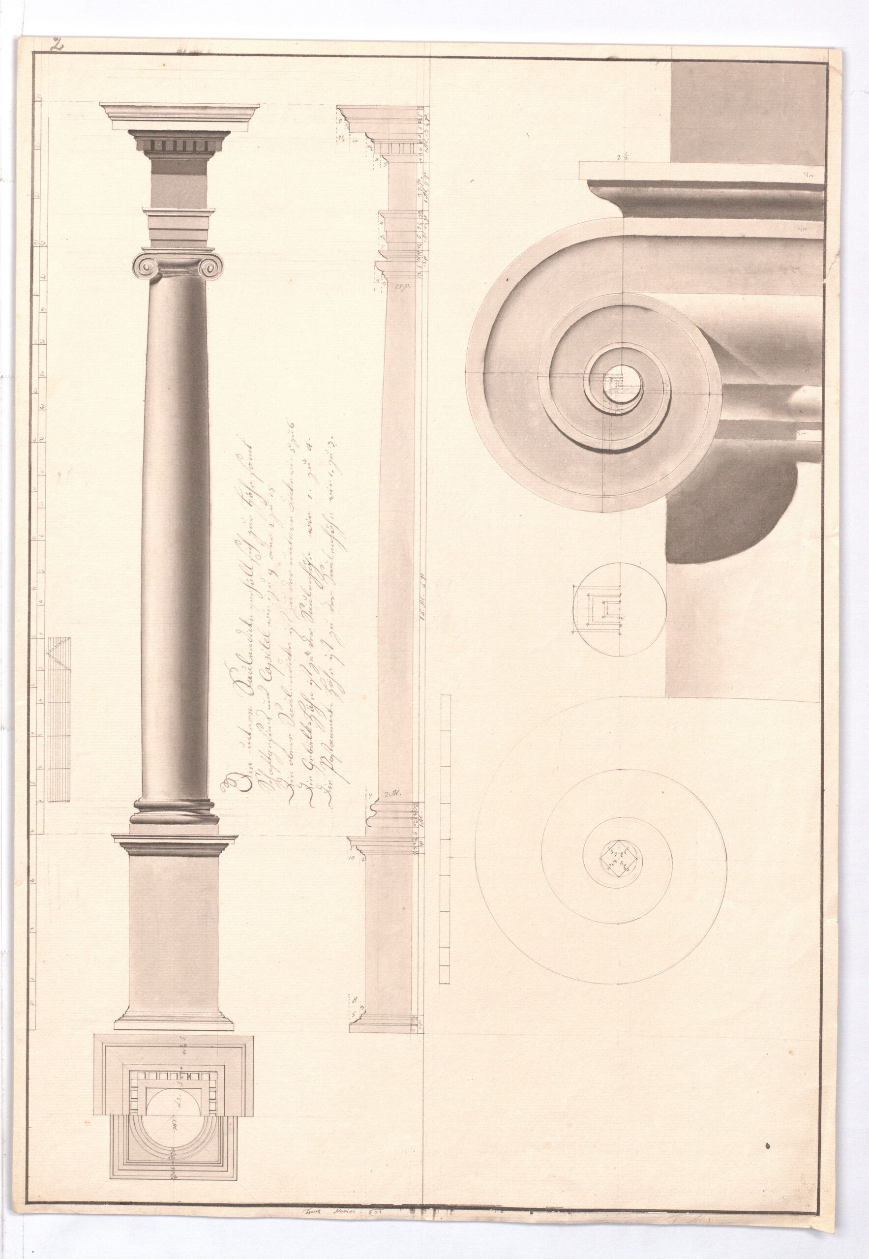 - 作品に記載されている文章: Die untere Säulendicke verhält sich zur Höhe samt / Schaftgesims und Capitel wie 1. zu 9. oder 2 zu 18. / Die obere Säulendicke ist zu der unteren Dicke wie 5. zu 6. / Die Gebälk Höhe ist zu der Säulenhöhe wie 1. zu 4. / Die Postament=Höhe ist zu der Säulenhöhe wie 1. zu 3. [sowie diverse Numerierungen und Maßangaben in Model, alles Feder in Grau]; 2 [Bleistift nachträglich, oben links]