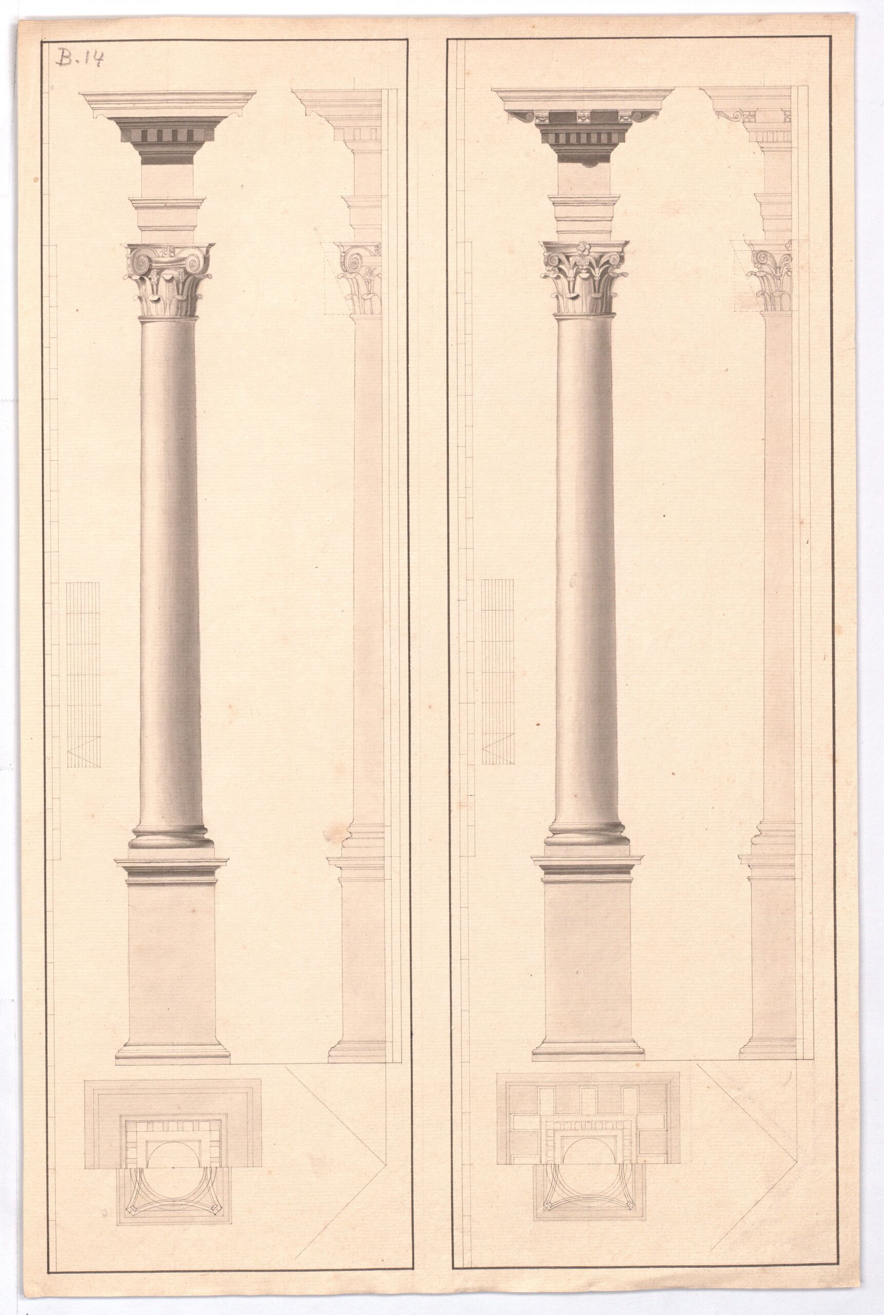 Aufriß und Grundriß zweier Säulenordnungen nach Vignola mit der Römisch-Korinthischen auf der linken und der Korinthischen auf der rechten Blatthälfte.
