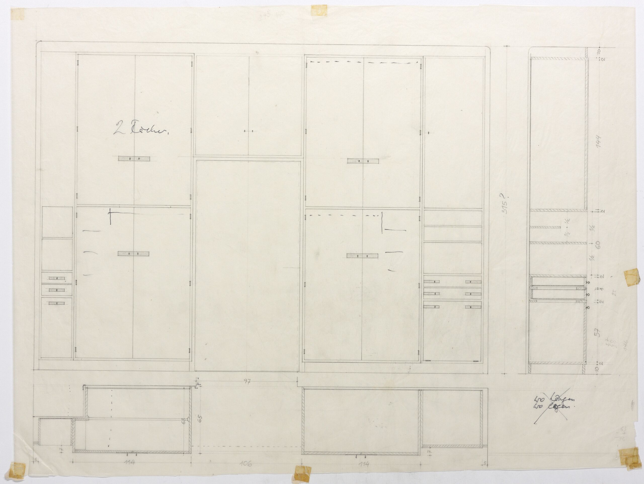 デザイン, Aufriss, Querschnitt und Grundriss eines Einbaukastens, Anna-Lülja Praun, MAK Inv.nr. KI 16475-5-396