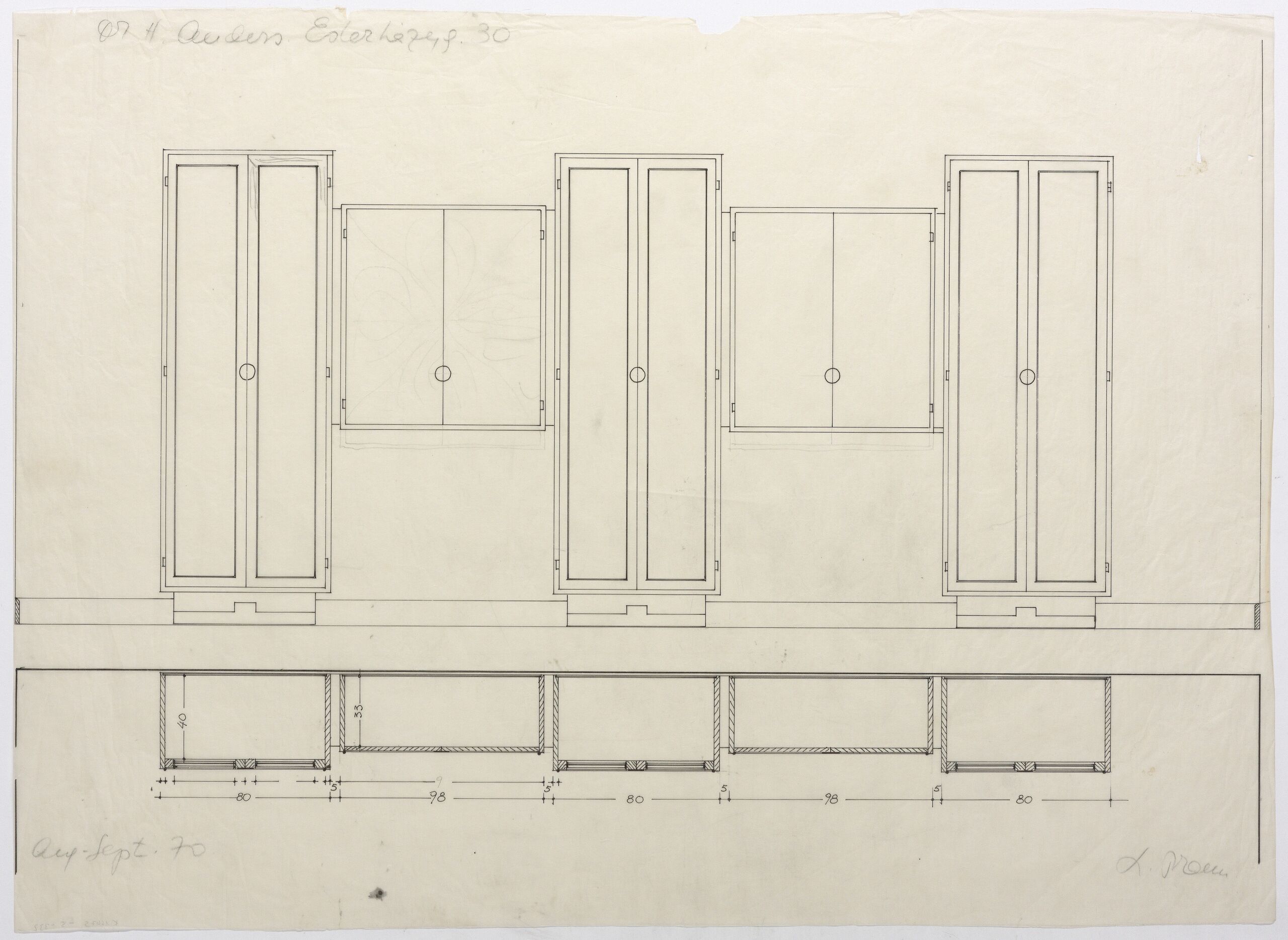 デザイン, Aufriss und Grundriss einer Wand mit Schränken im Arbeitsraum, Anna-Lülja Praun, MAK Inv.nr. KI 16475-5-332