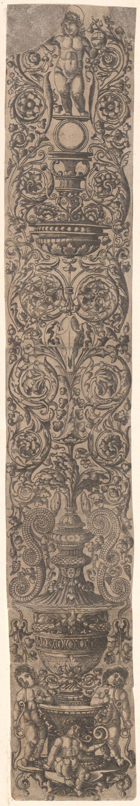 - Aufsteigendes Ornament, unten drei Horn- spielende Putti, Miller schreibt die Stiche Giovanni Pietro da Birago und Giovanni Antonio da Brescia zu, traditionellerweise wurde das Monogramm ZA mit “Zoan Andrea inv.” identifiziert (given title)