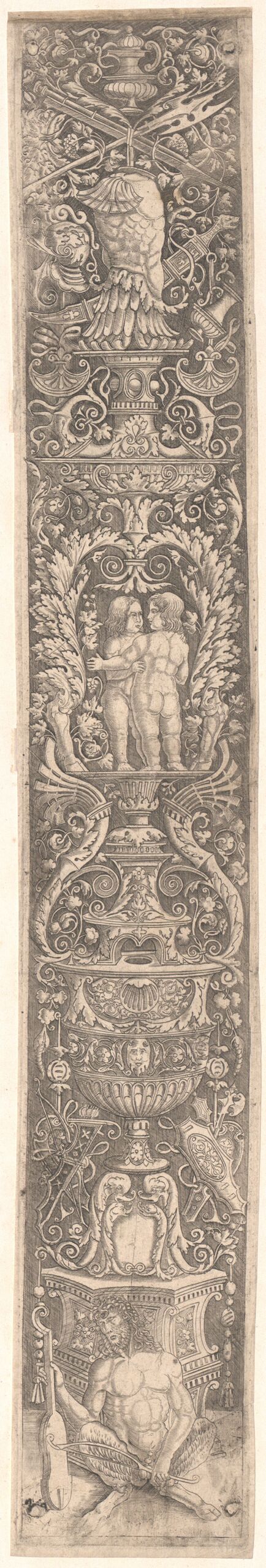 - Aufsteigendes Ornament, unten ein Satyr mit einer Violine, seitenverkehrte Kopie auf schraffiertem Grund nach B. 30, Miller schreibt die Stiche Giovanni Pietro da Birago und Giovanni Antonio da Brescia zu, traditionellerweise wurde das Monogramm ZA mit “Zoan Andrea inv.” identifiziert (given title)