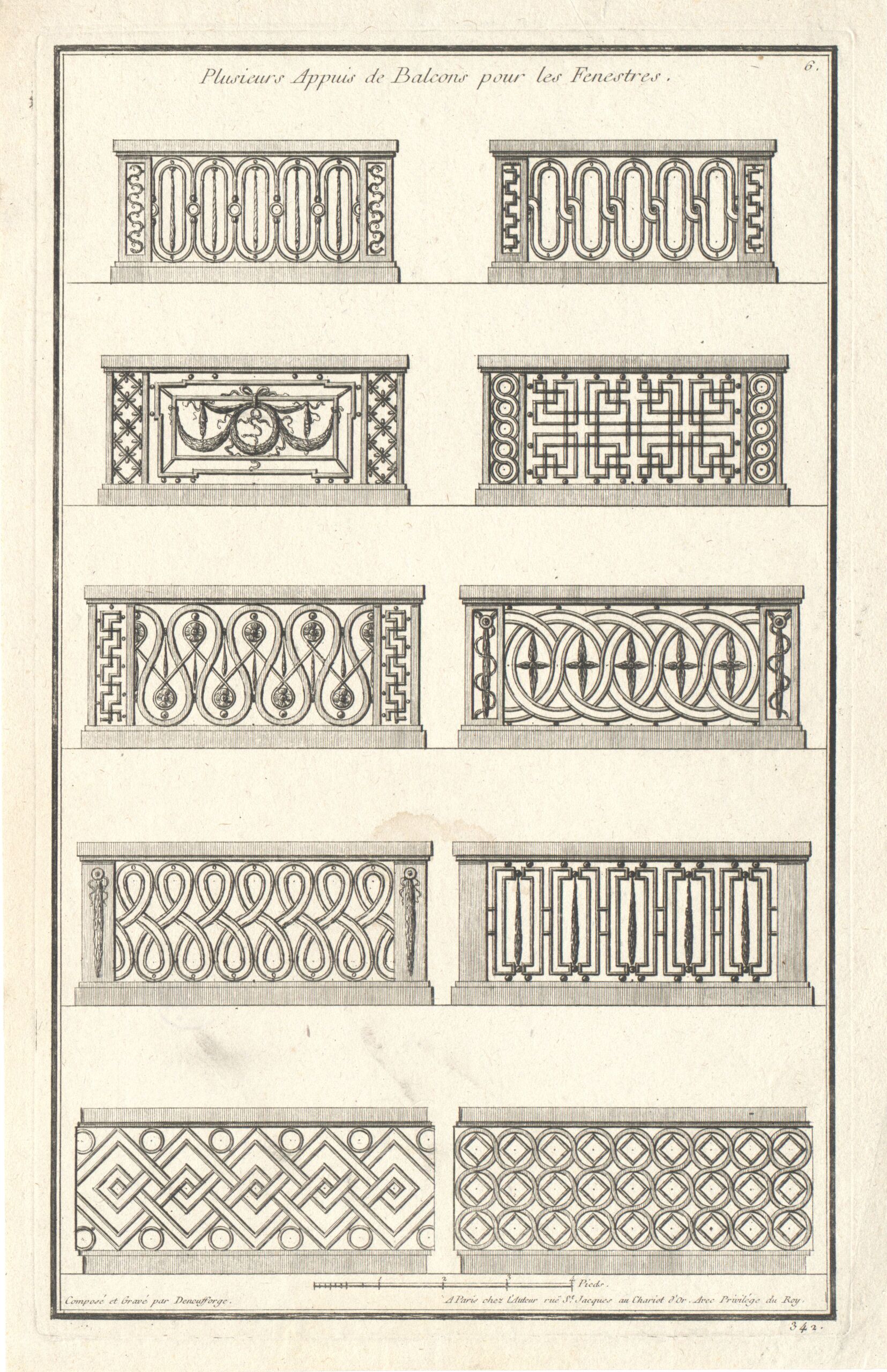 - 作品に記載されている文章: Plusieurs Appuis de Balcons pour les Fenestres. / 6. 342 / Composé et Gravé par Deneufforge. / A Paris chez l‘ Auteur rue S.t Jacques au Chariot d‘ Or Avec Privilége du Roy.
