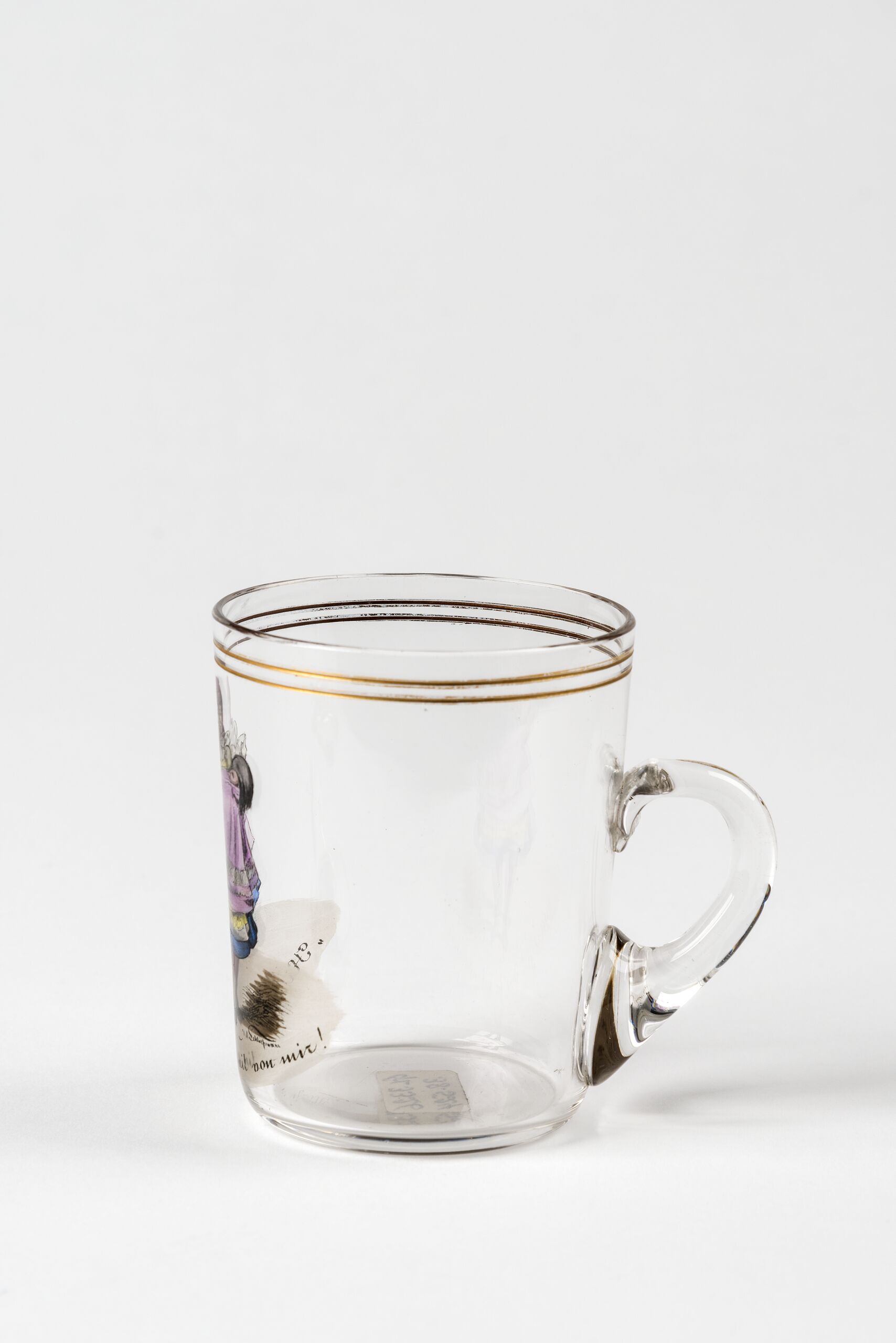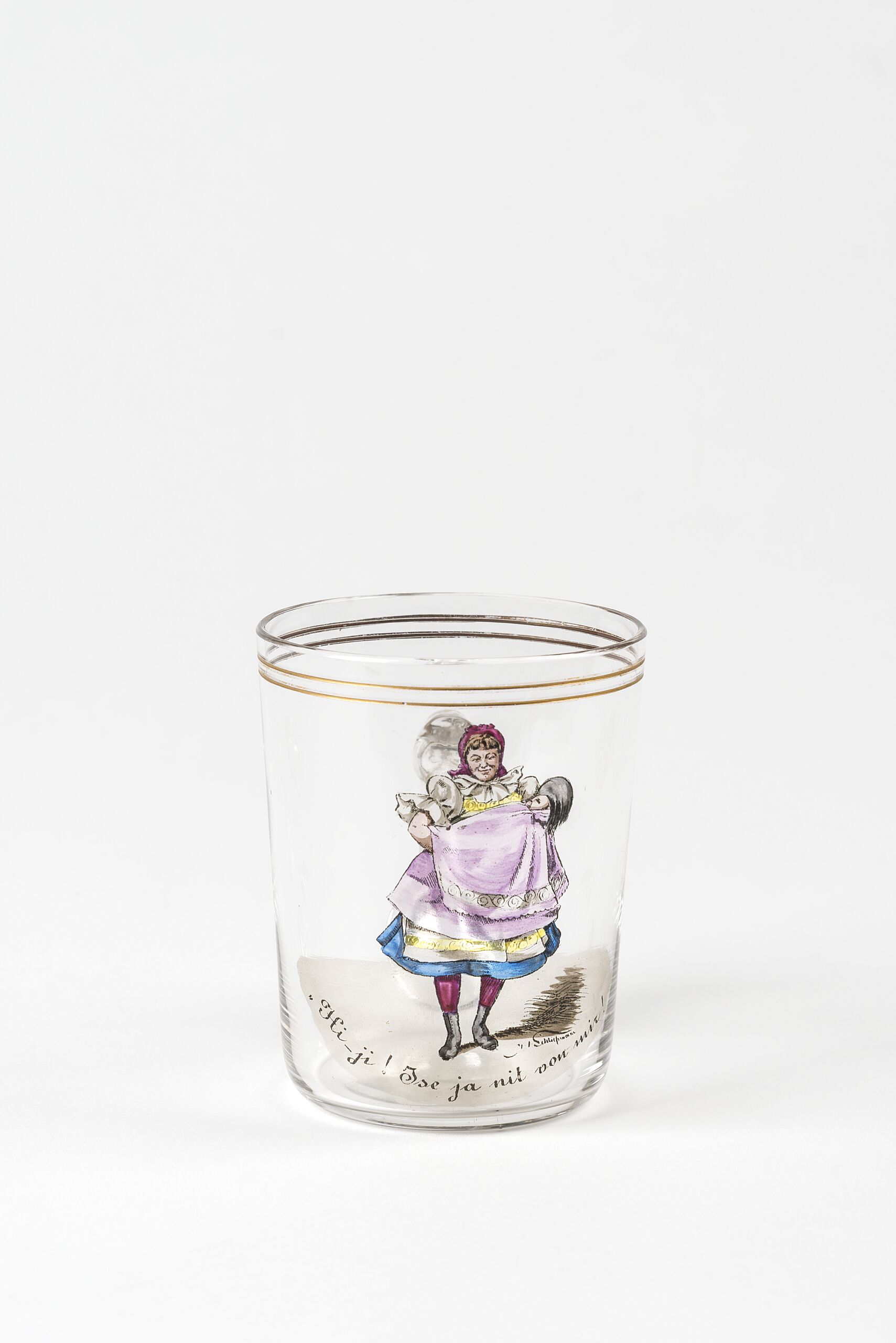 Henkelbecher, farblos. Zylindrische Form, die sich nach oben etwas erweitert. Auf der Becherwandung zwei Goldringe und bunte Transparentmalerei: Frau mit blauem Rock, roten Strümpfen und rotem Kopftuch trägt ein Wickelkind im Arme. Inschrift: "Hi-ji! Ise ja nit von mir!"