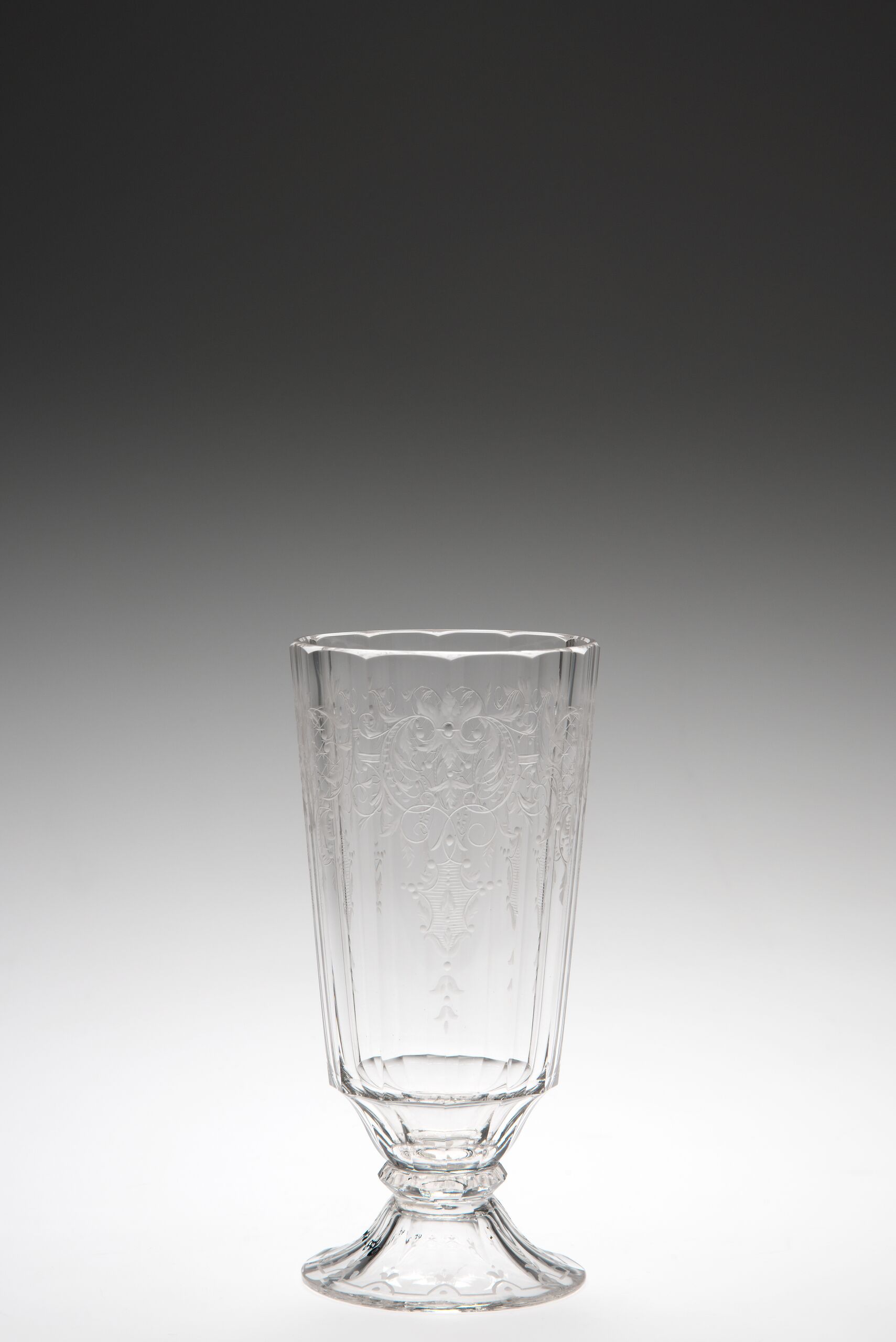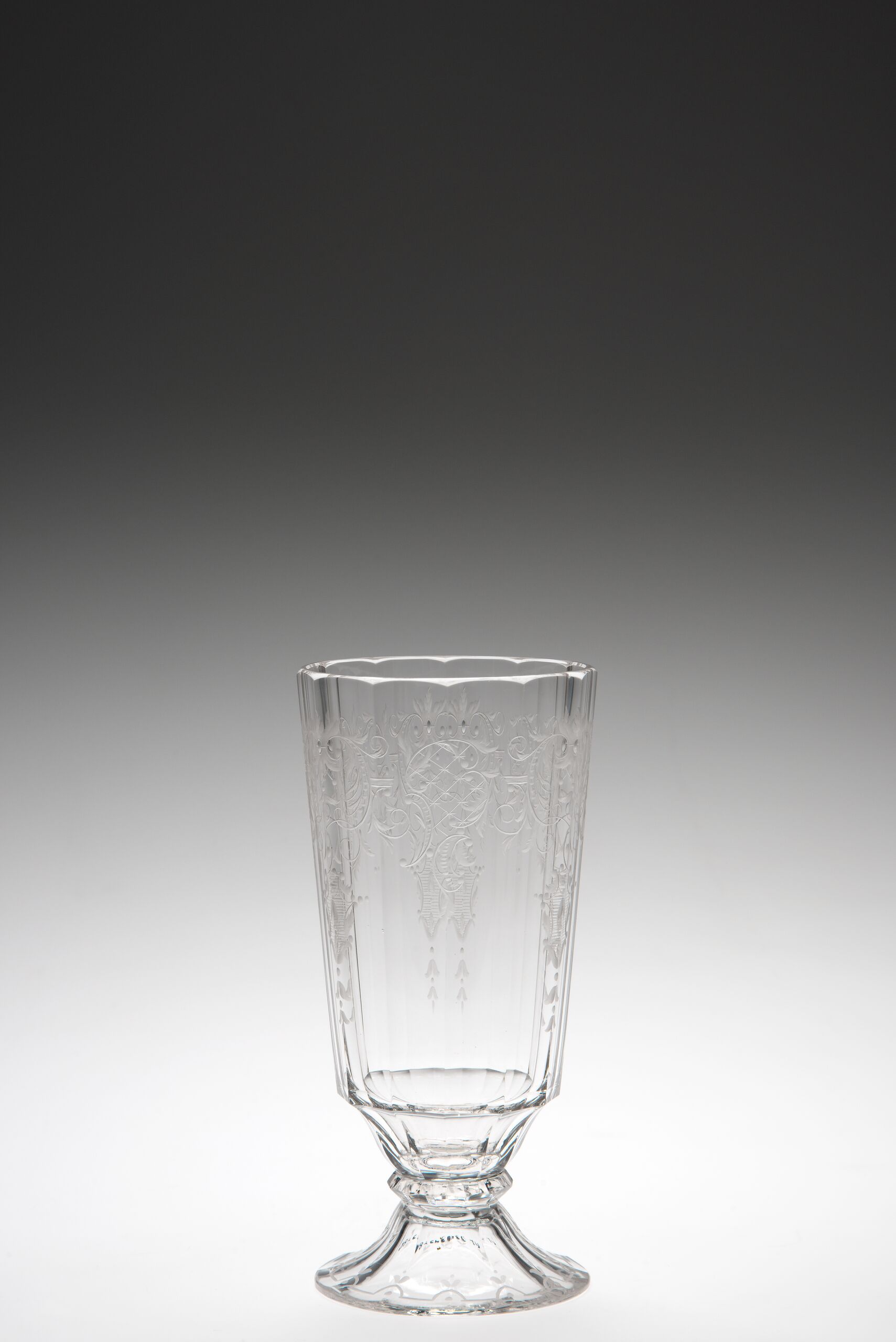 reich ornamentiert, geschliffen und graviert, hohe Becherform auf niedrigem Fuss
