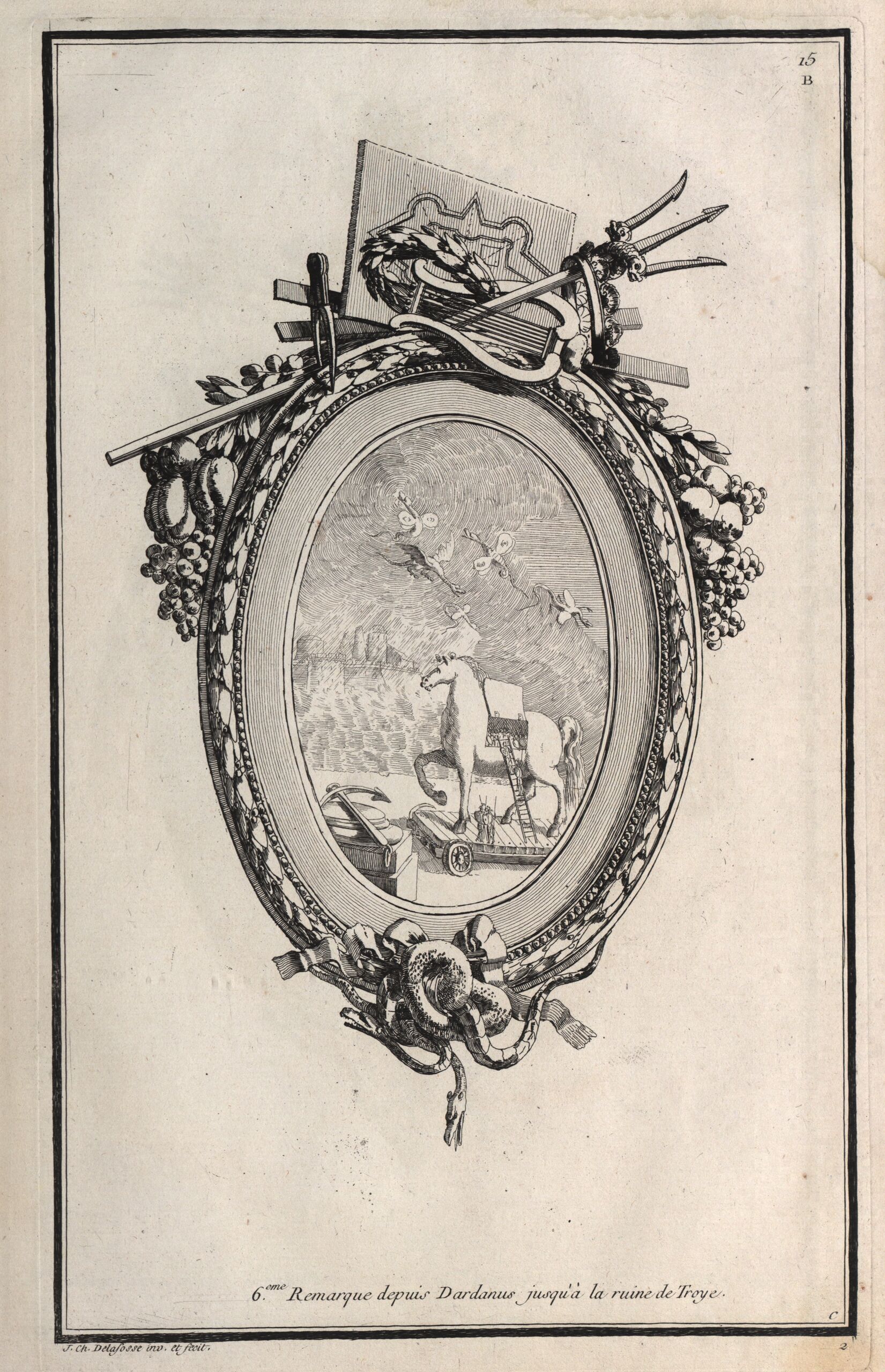 - 作品に記載されている文章: 6eme Remarque depuis Dardanus jusqu’ a la ruine de Troye. / J. Ch. Delafosse inv. et fecit. / C 2
