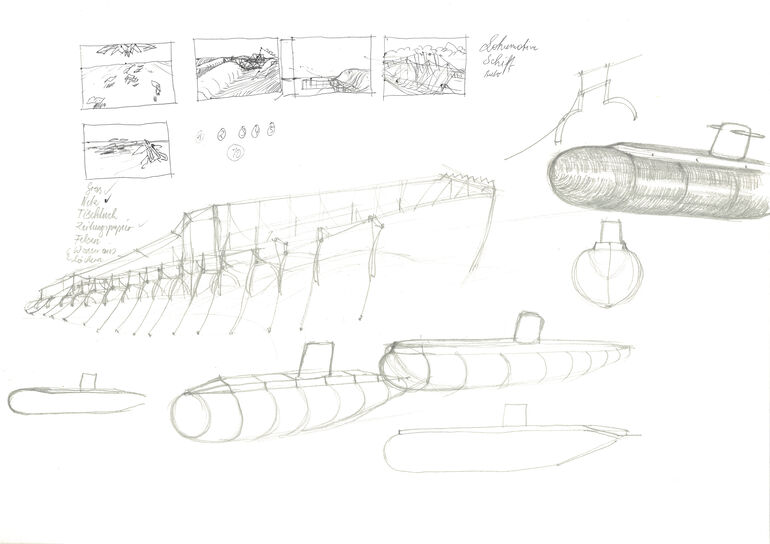 Blatt eines Skizzenblock mit 25 Blatt um 1971/72 in A3-Querformat der u. a. zeigt Entwurfszeichnungen eines nicht ausgeführten Bauprojekts, Vorstudien zu den Objektentwürfen aus dem Umfeld der Aktion Bauhof Spiluttini,