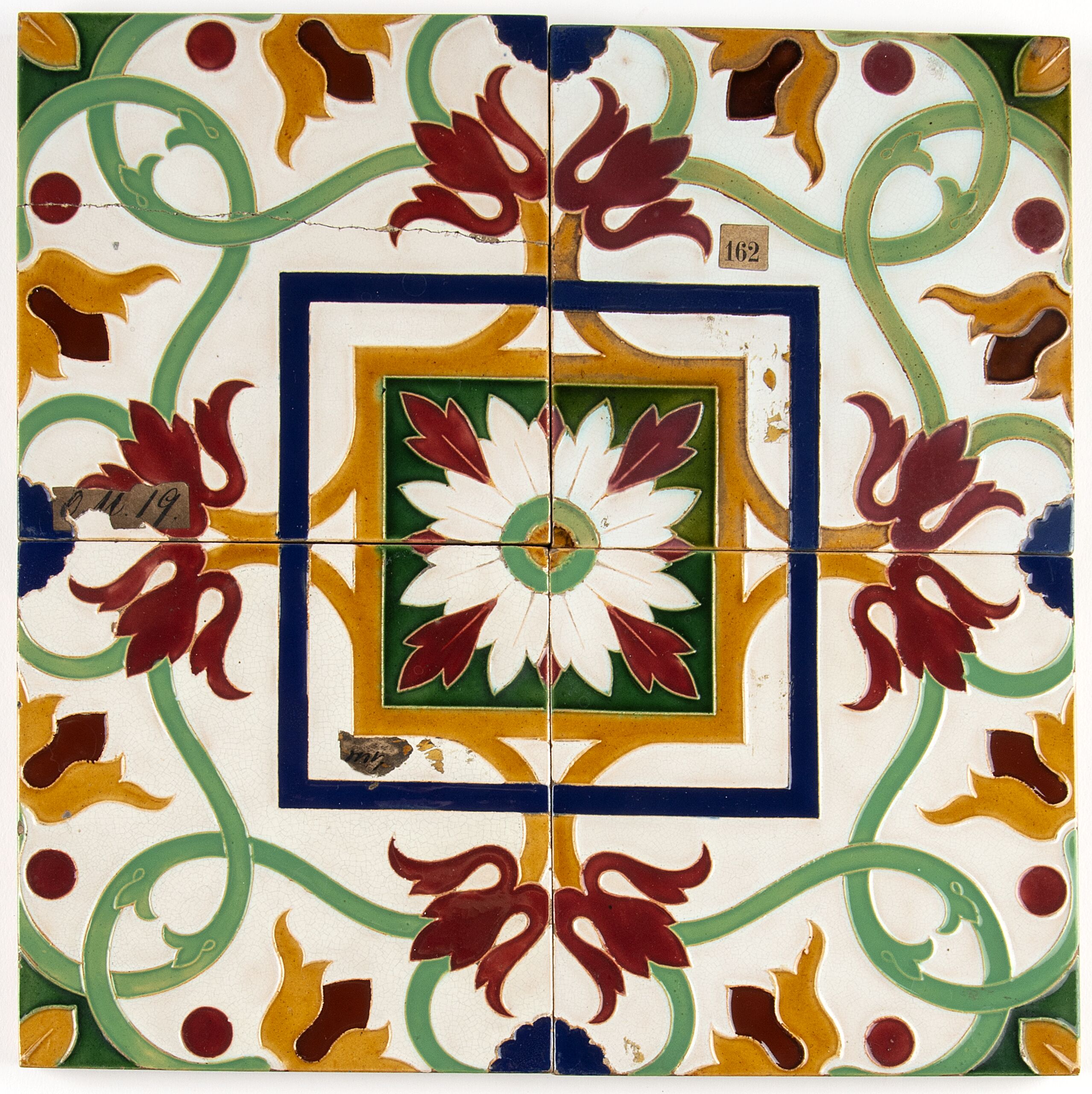 ein florales Ornament, dessen Motiv sich aus 4 Fliesen zusammensetzt: Zusammengefasst: Mitte weiße Blume, die quadratisch von blauen und grünen Bändern umrahmt, restliche Fläche von grünen Ranken mit roten und ockerfarbigen Blumen bedeckt, alle vor erhöhtem weißen Grund