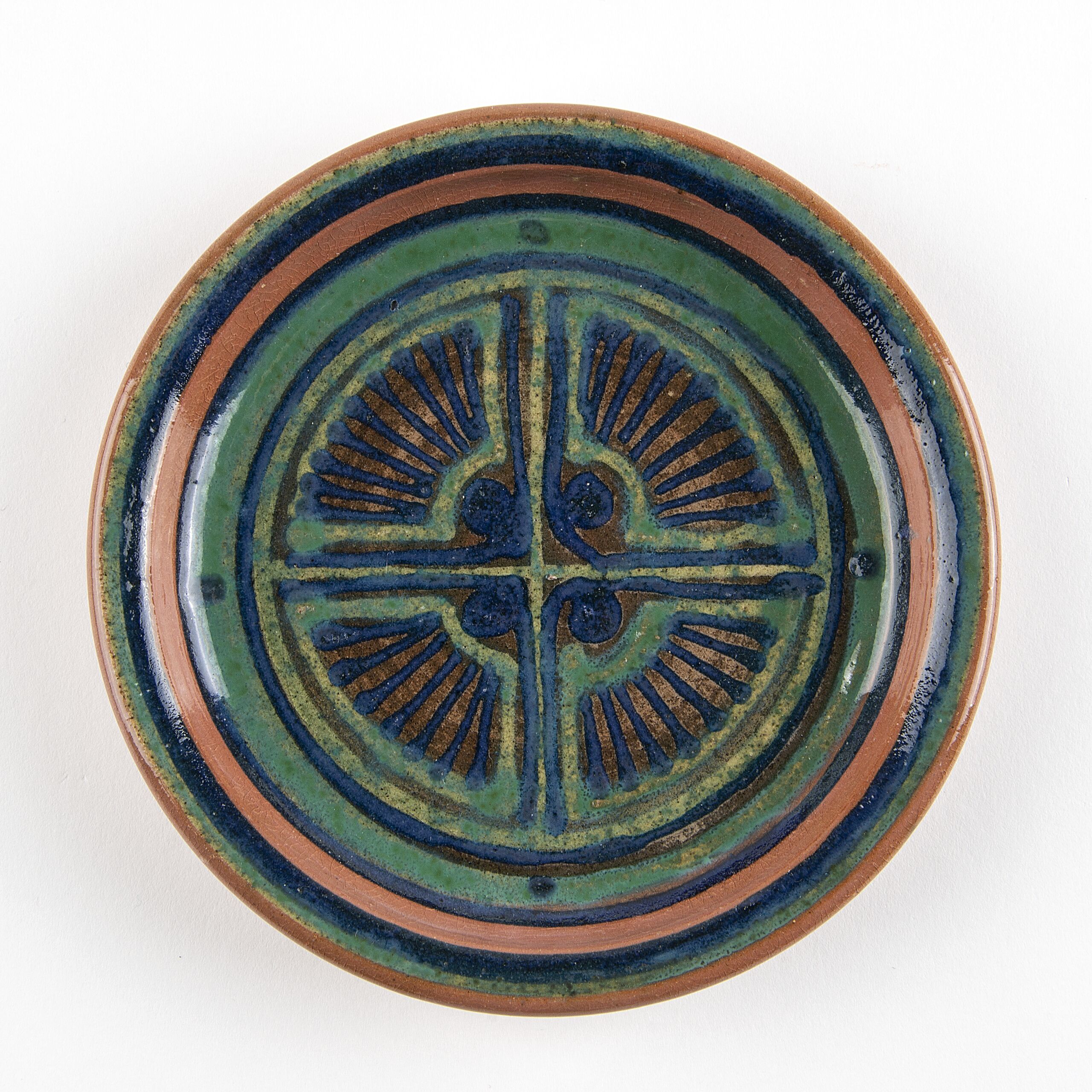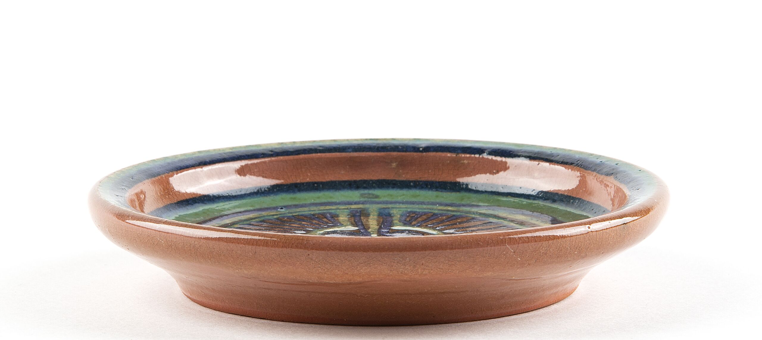 Schale, Ton, roter Scherben, getöpfert, innen Schlickermalerei grün und blau, transparente glänzende Glasur