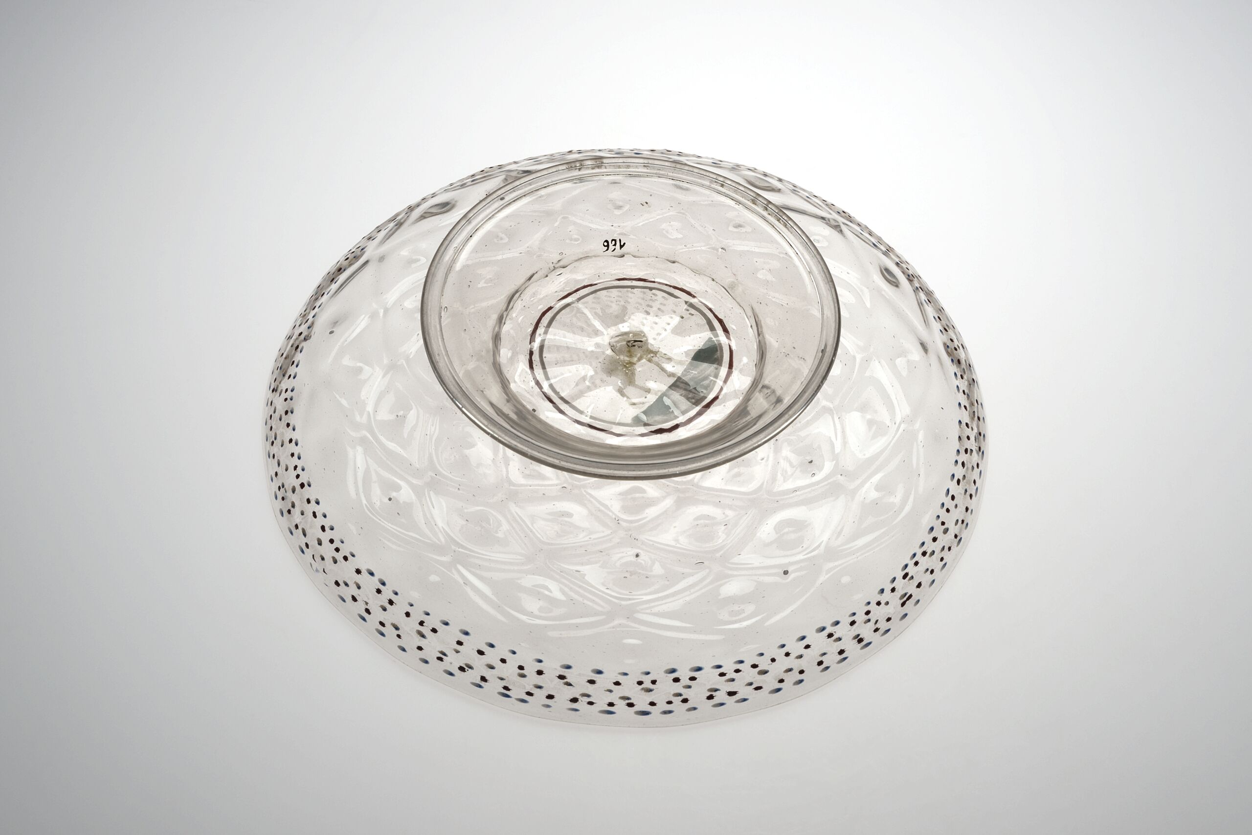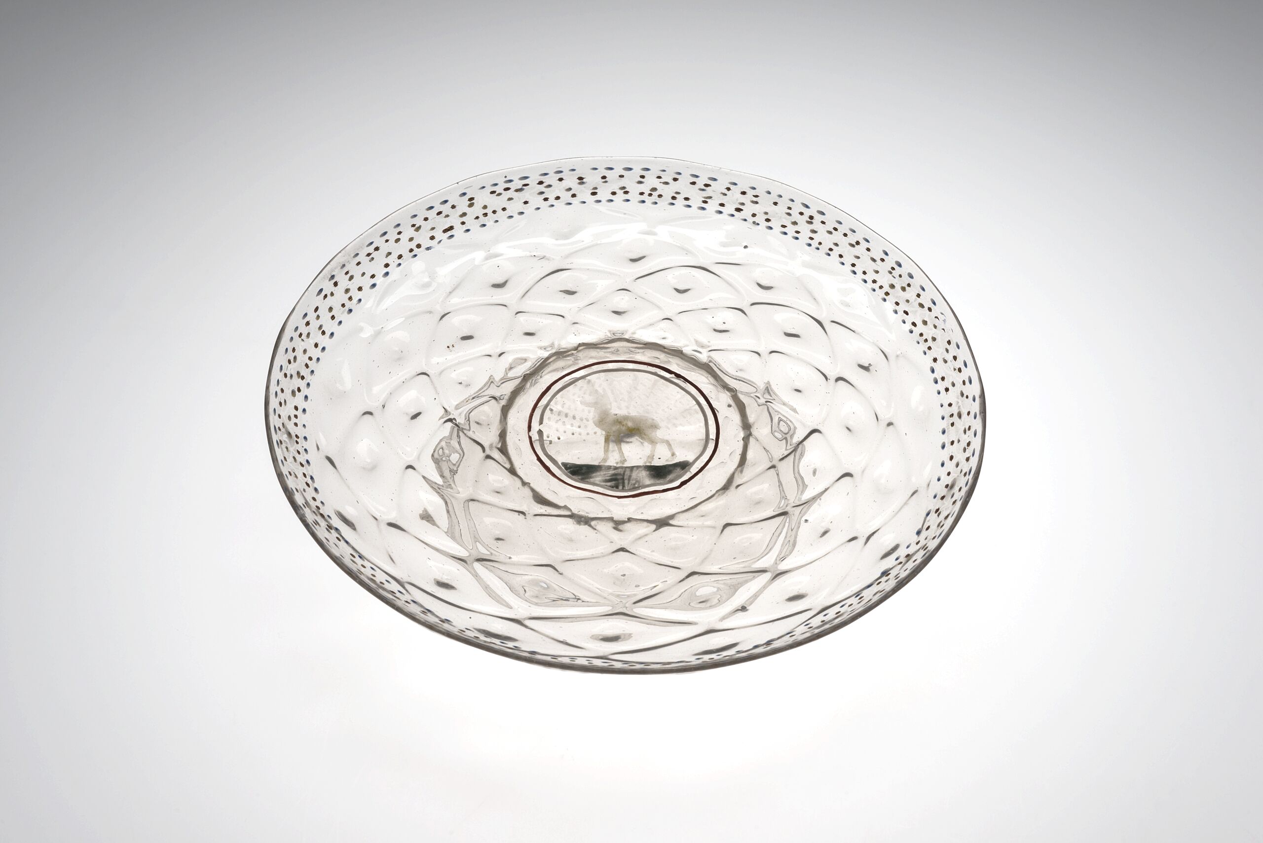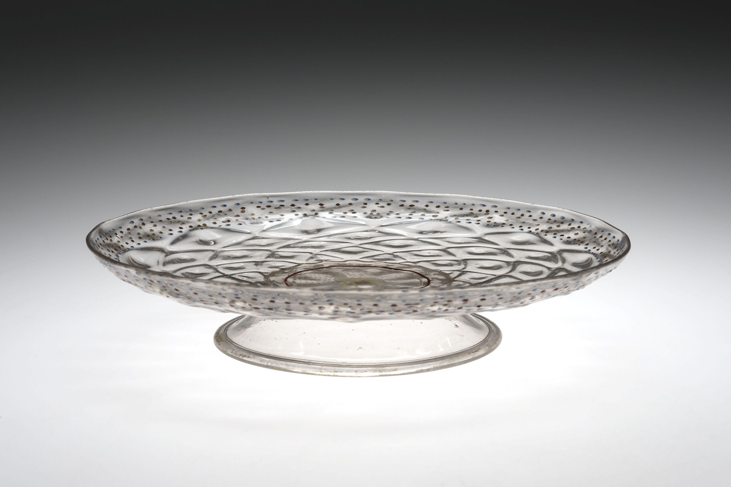 Flache gerautete Schale auf niedrigem Fuss. Am Rand Fries aus Goldschuppen und Emailpunkten. Im Fond Reste einer Emailmalerei Wolf im Sonnenschein. Fussrand umgelegt, vergoldet