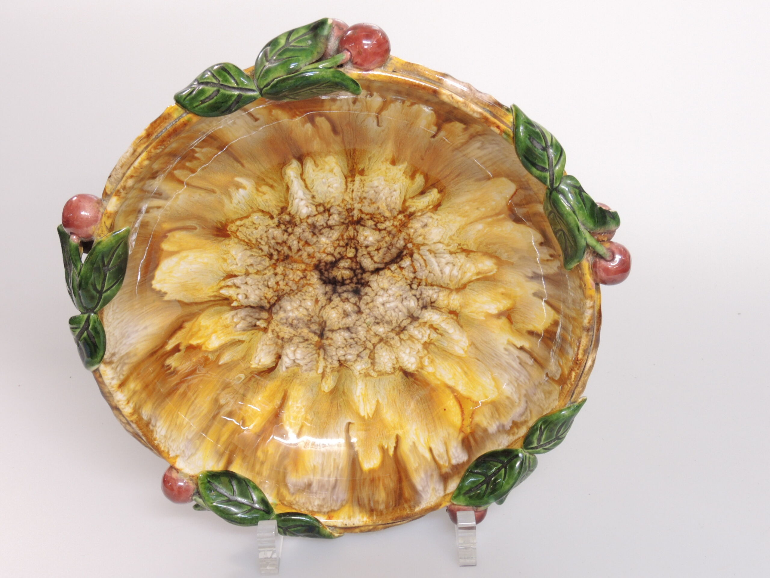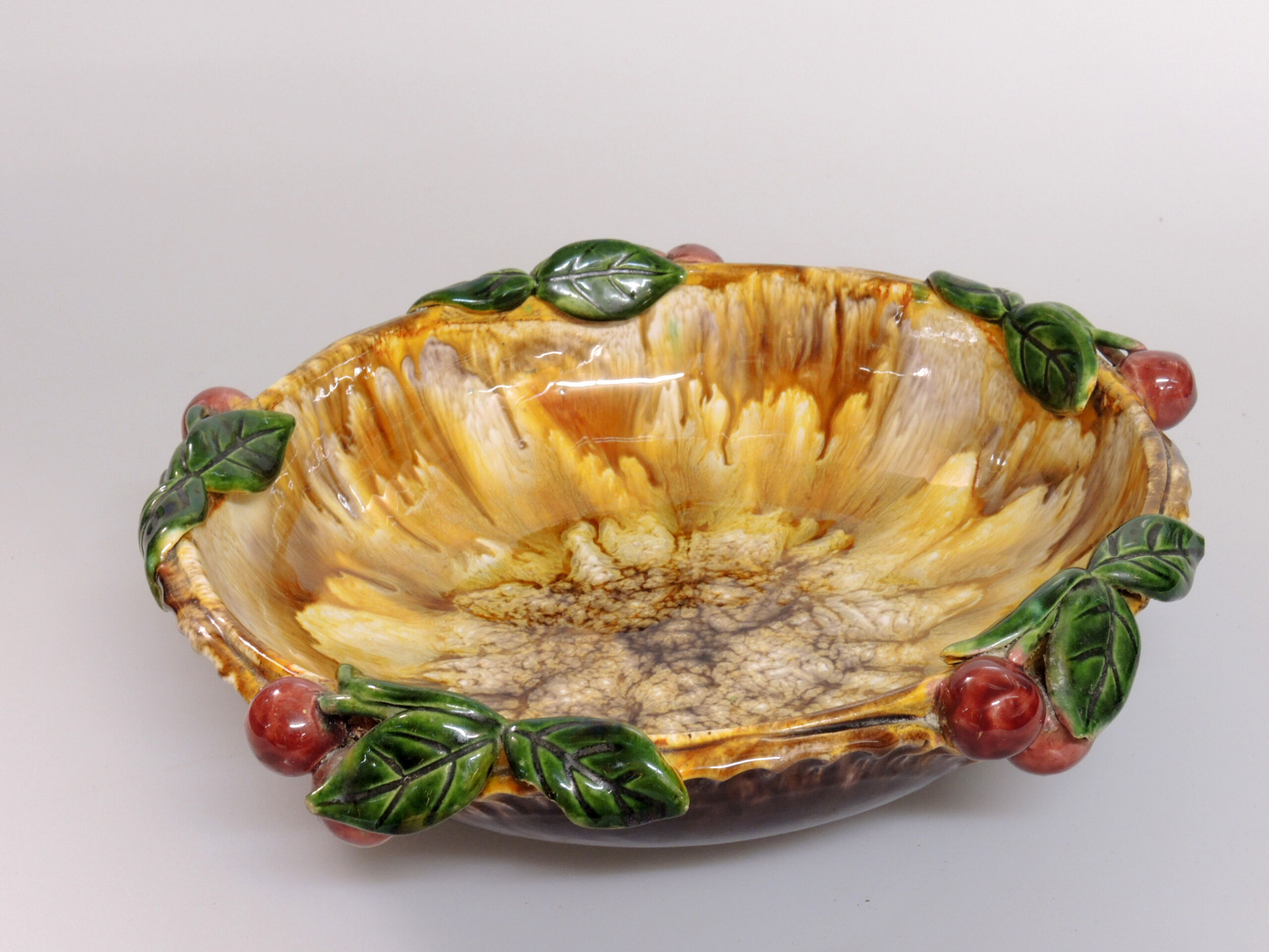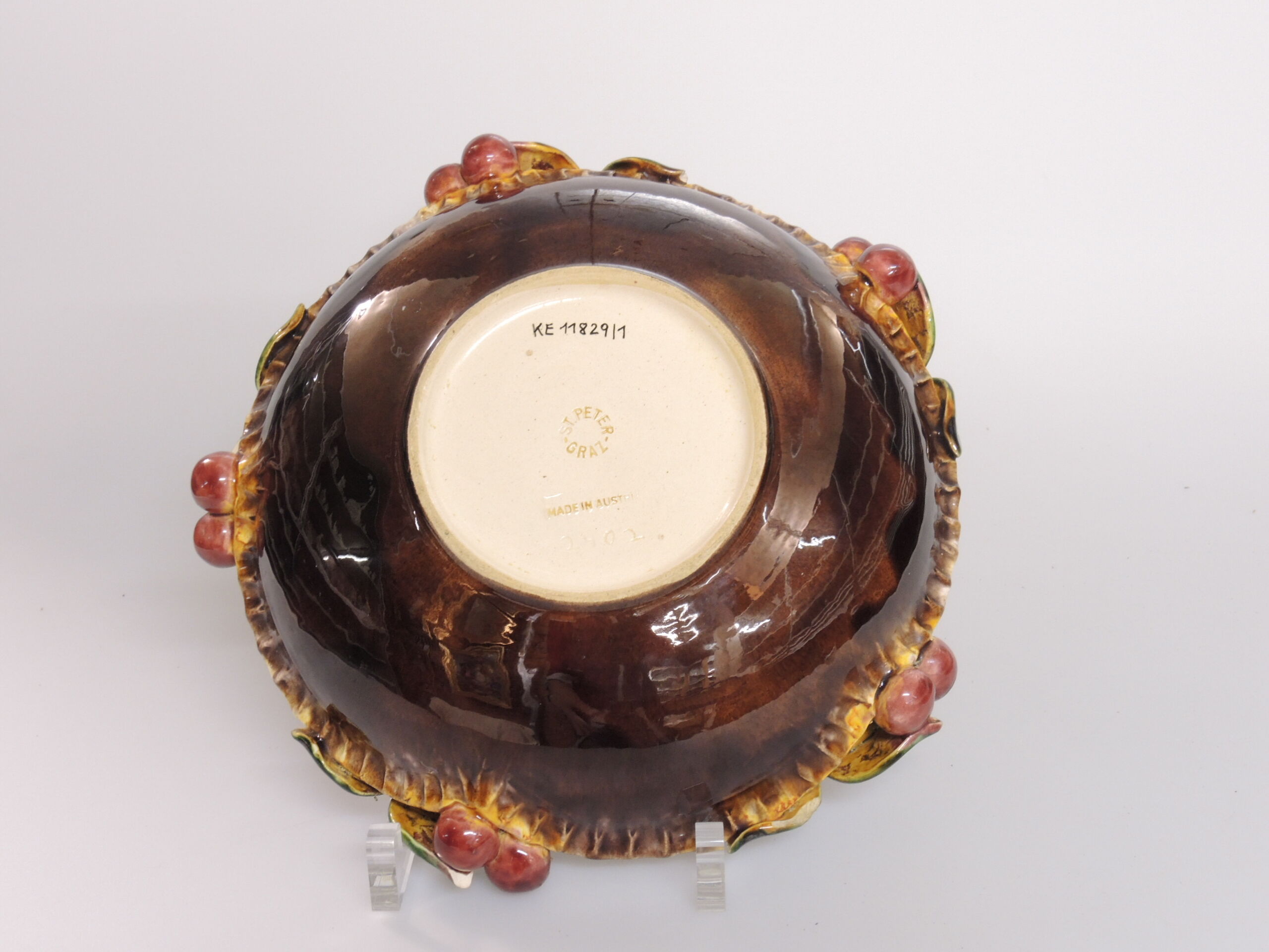 weite Schüssel, gegossen, am Rand mit applizierten Früchten (Kirschen?) und Blättern, innen und aussen braun glasiert, Obst in rot und Blätter in grün