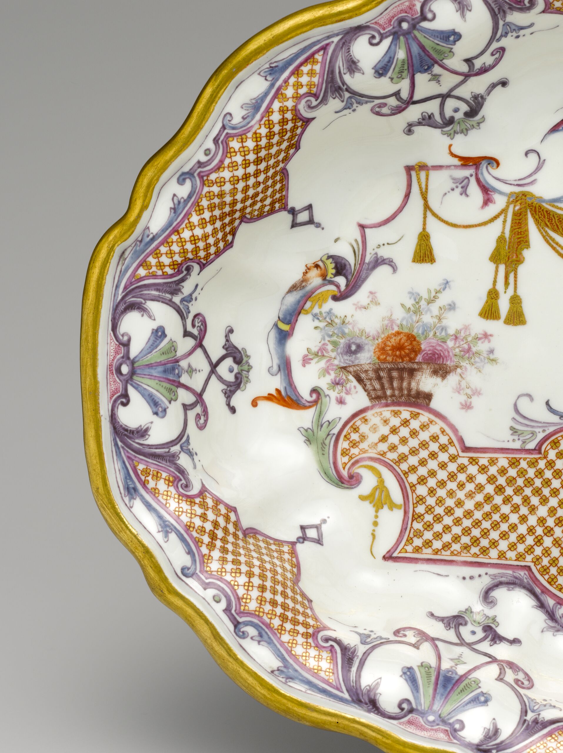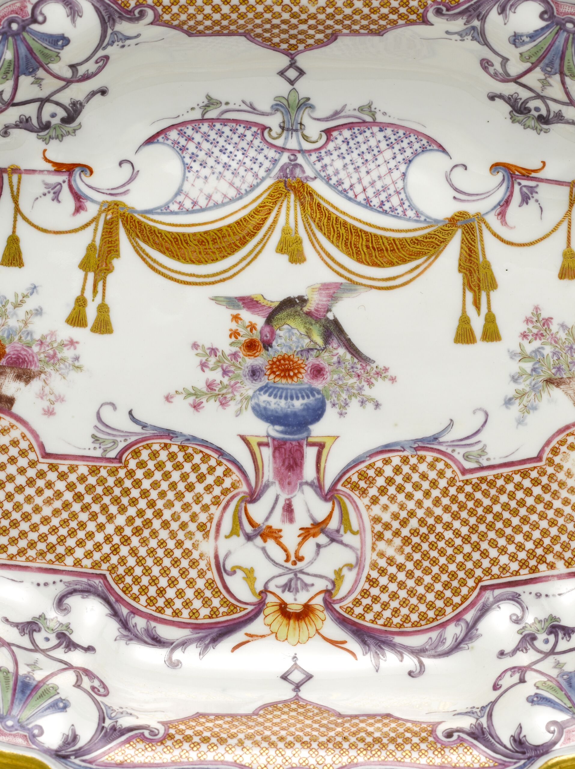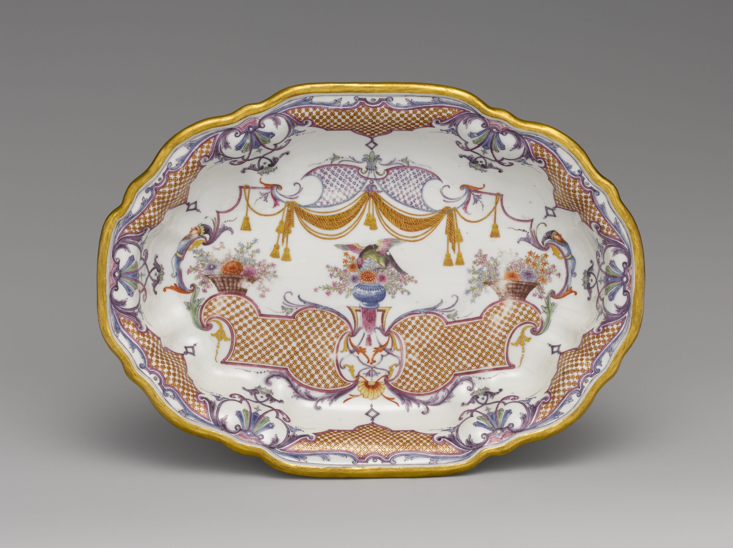 - Untersatz für eine kleine Terrine, ovale Form mit geschweiftem Rand. Der Spiegel dicht bedeckt mit einer Komposition aus bunten, goldgehöhten Gitterwerkfeldern, Laub- und Bandelwerkelementen, Blumenkörben, Blumenvasen mit Vogel, Vorhangdraperie und Grotesken, der Rand mit Gitterwerk und Palmettenmotiven. Auf der Außenwand Blütenzweige. Die unglasierte Standfläche mit Laub- und Bandelwerk auf hell- und dunkelgrünem Grund