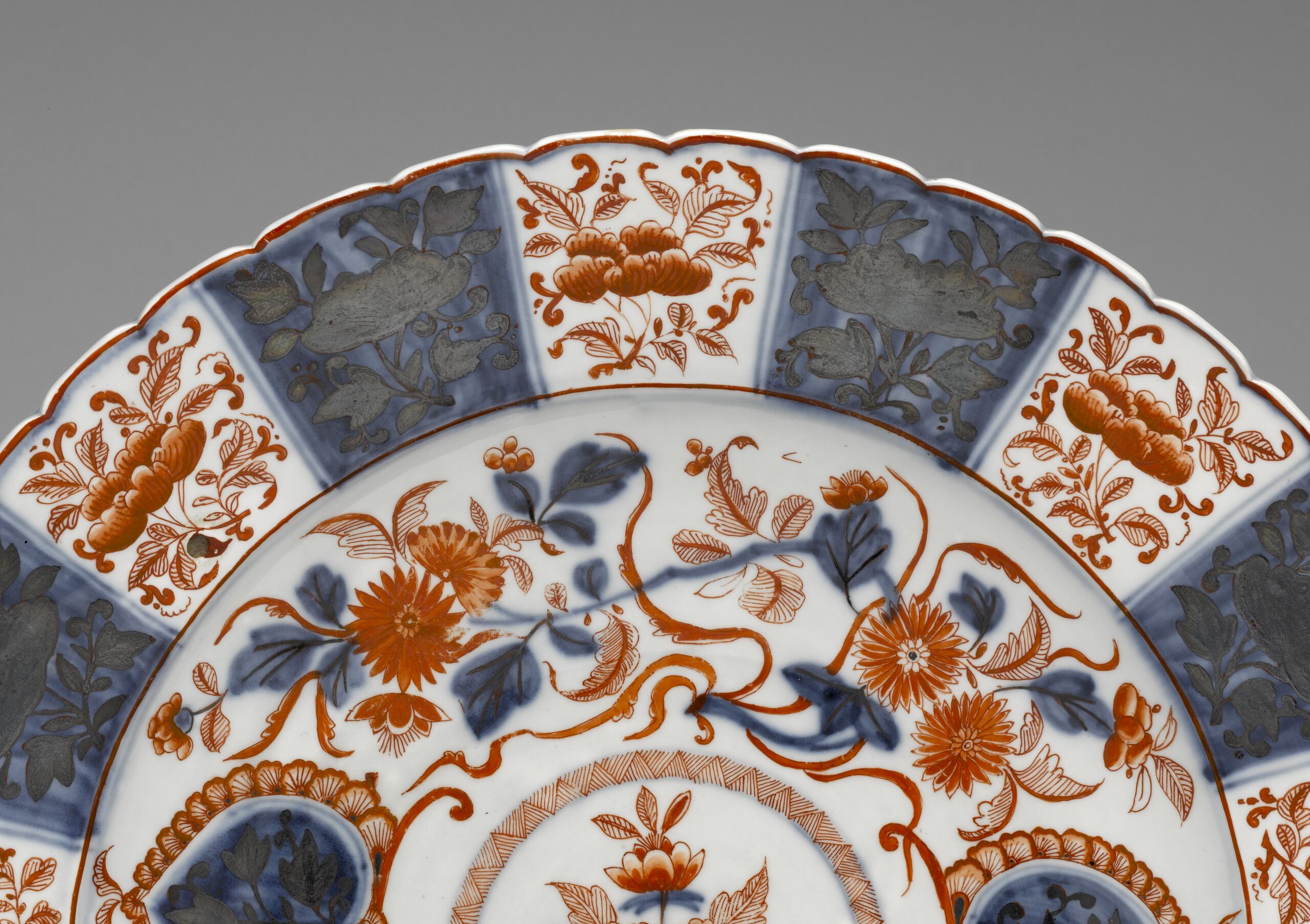 Diese große Servierschüssel trägt einen eindrucksvollen Dekor: Auf der Fahne entlang des geschweiften Randes alternieren weiße und unterglasurblaue Felder, die mit herzförmigen Blättern, Zweigen und jeweils einem Blumenmotiv in der Mitte geschmückt sind. Den Spiegel füllen mäandernde eisenrote Blumen und Blätter, die eine gewisse Bewegung in die Komposition bringen, ein Innenring mit einem roten Zackenmuster und Lotusblumen in herzförmigen Kartuschen, die von einem Zierband aus Blütenblättern eingefasst werden. Alle diese Elemente sind japanischem Imari-Porzellan nachempfunden, obwohl für die Bemalung dieser Schüssel kein Gold sondern Silber verwendet wurde. Die silbernen Blumen auf den unterglasurblauen Randfeldern finden ihre genaue Entsprechung in den eisenroten Blumen der weißen Felder. Auch die Lotusblüten sind mit silbernen Mustern verziert, wie auch die Blätter im Spiegel silberne Glanzlichter tragen. Mir ihrem zart schimmernden Silberdekor auf dem dunklen Unterglasurblau muss die Schüssel, als das Silber noch nicht schwarz angelaufen war, außergewöhnlich prächtig ausgesehen haben