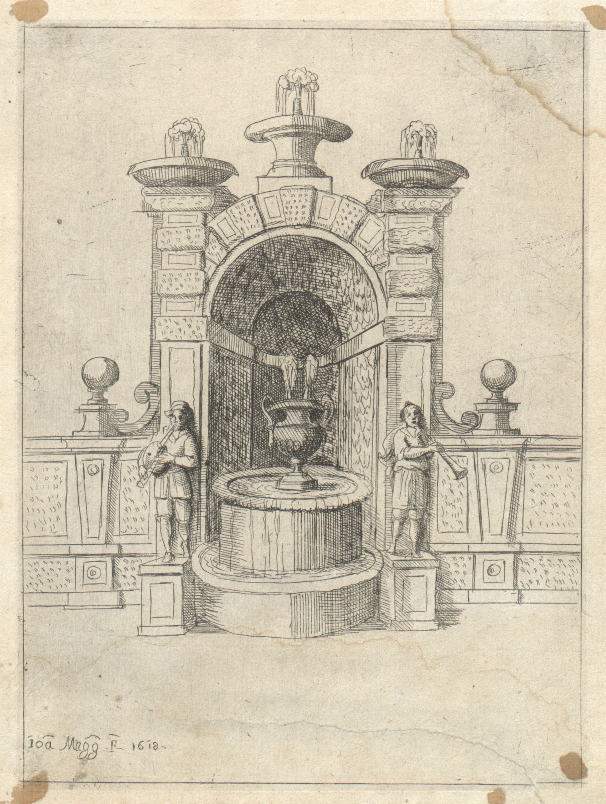 - Brunnen, Blatt aus der Folge „Nuova Raccolta Di Fontane Che Si Vedono Nel Alma Citta Di Roma Tivoli E Frascati“, herausgegeben von G. de Scachi (given title)
