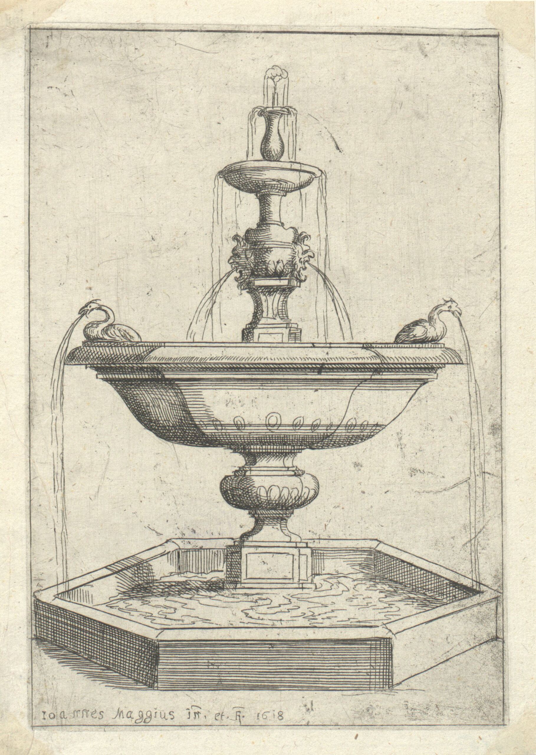- Brunnen, Blatt aus der Folge „Nuova Raccolta Di Fontane Che Si Vedono Nel Alma Citta Di Roma Tivoli E Frascati“, herausgegeben von G. de Scachi (given title)