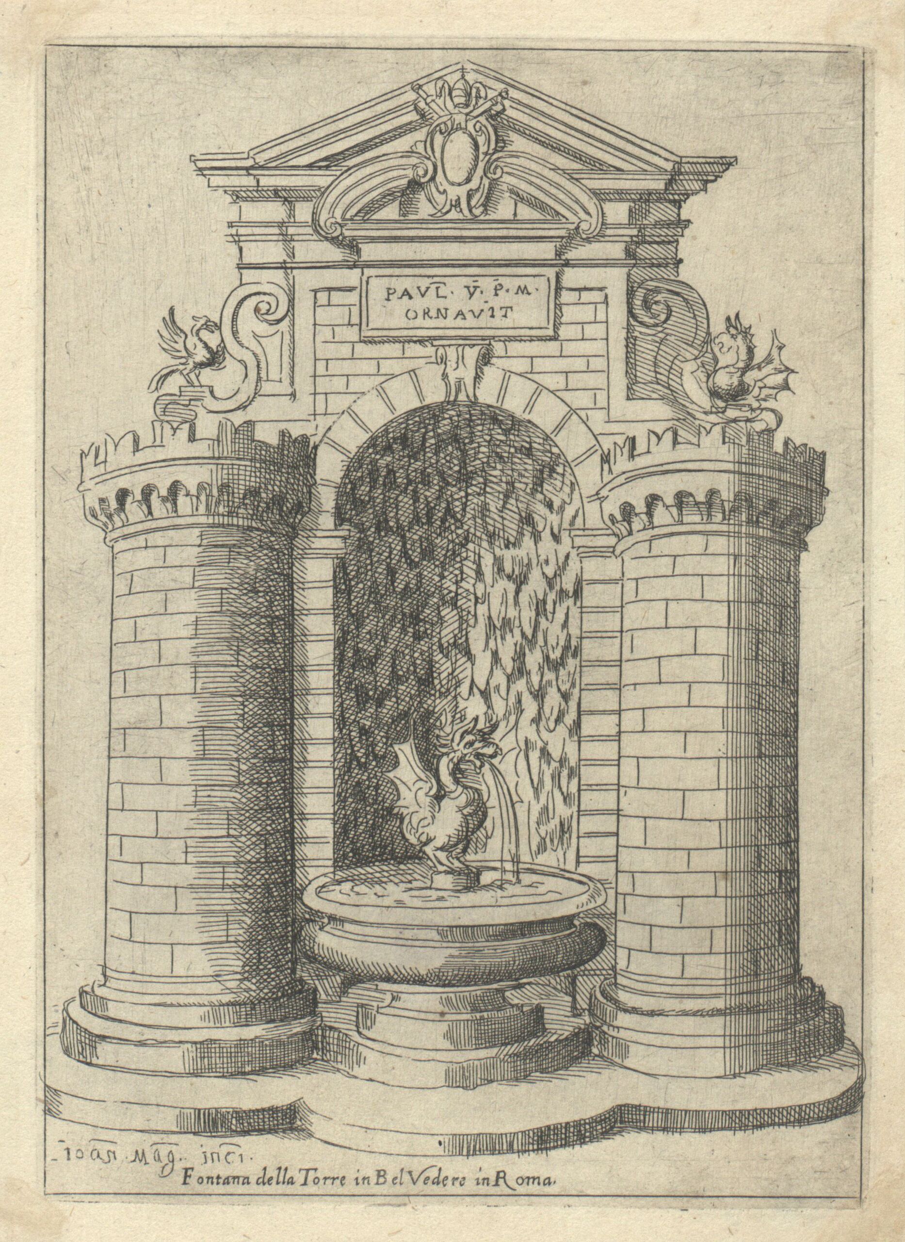 - 作品に記載されている文章: ioan. Mag. inci. / Fontana della Torre in Bel Vedere in Roma / PAUL. V. P. M./ ORNAVIT