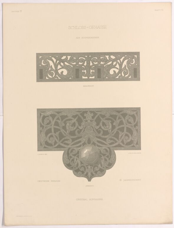 - 作品に記載されている文章: SECTION VI; BLATT 11; BRUNNEN.; ITAL. RENAISSANCE 16. JAHRHUNDERT.; ORIGINAL AUFNAMHE IN 1/7 DER NATURGRÖSSE.; J. STORCK GEZ.; LITH. R. V. WALDHEIM; ORIGINAL-COMPOSITION VON PROF. STORCK.; VERLAG VON R. V. WALDHEIM; STORCK'S ZEICHENVORLAGEN.