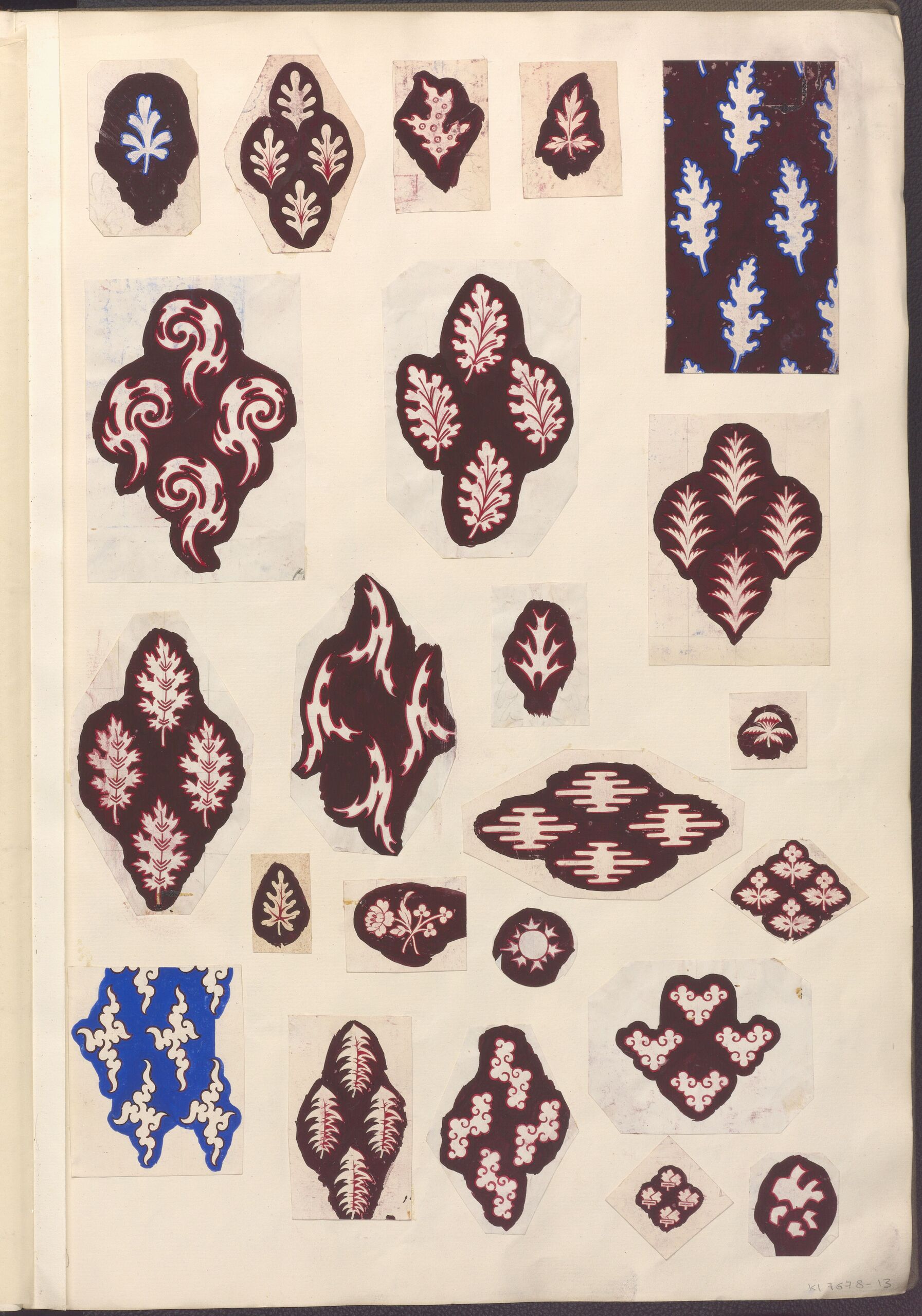 wallpaper design, Buchseite mit 23 Ornamententwürfen aus einem Sammelband mit Originalzeichnungen für Stoff- und Tapetenmuster, Anonym, MAK Inv.nr. KI 7678-13