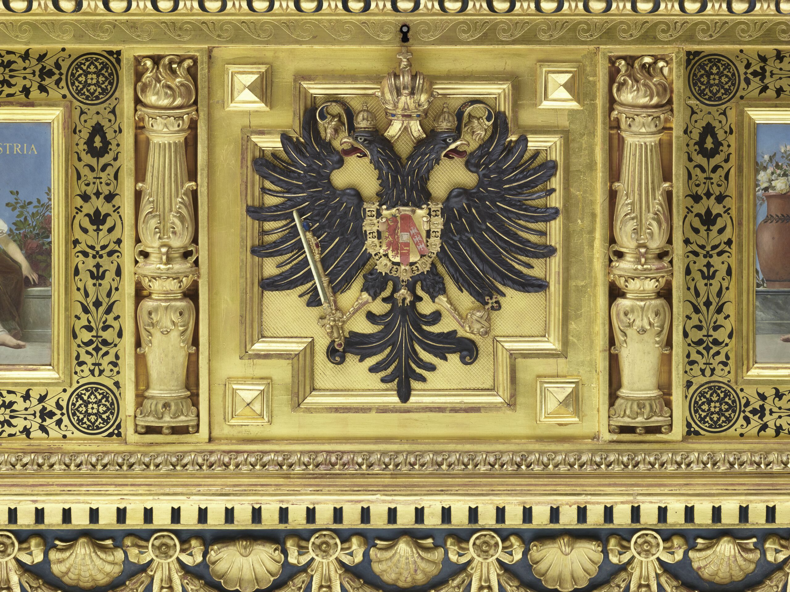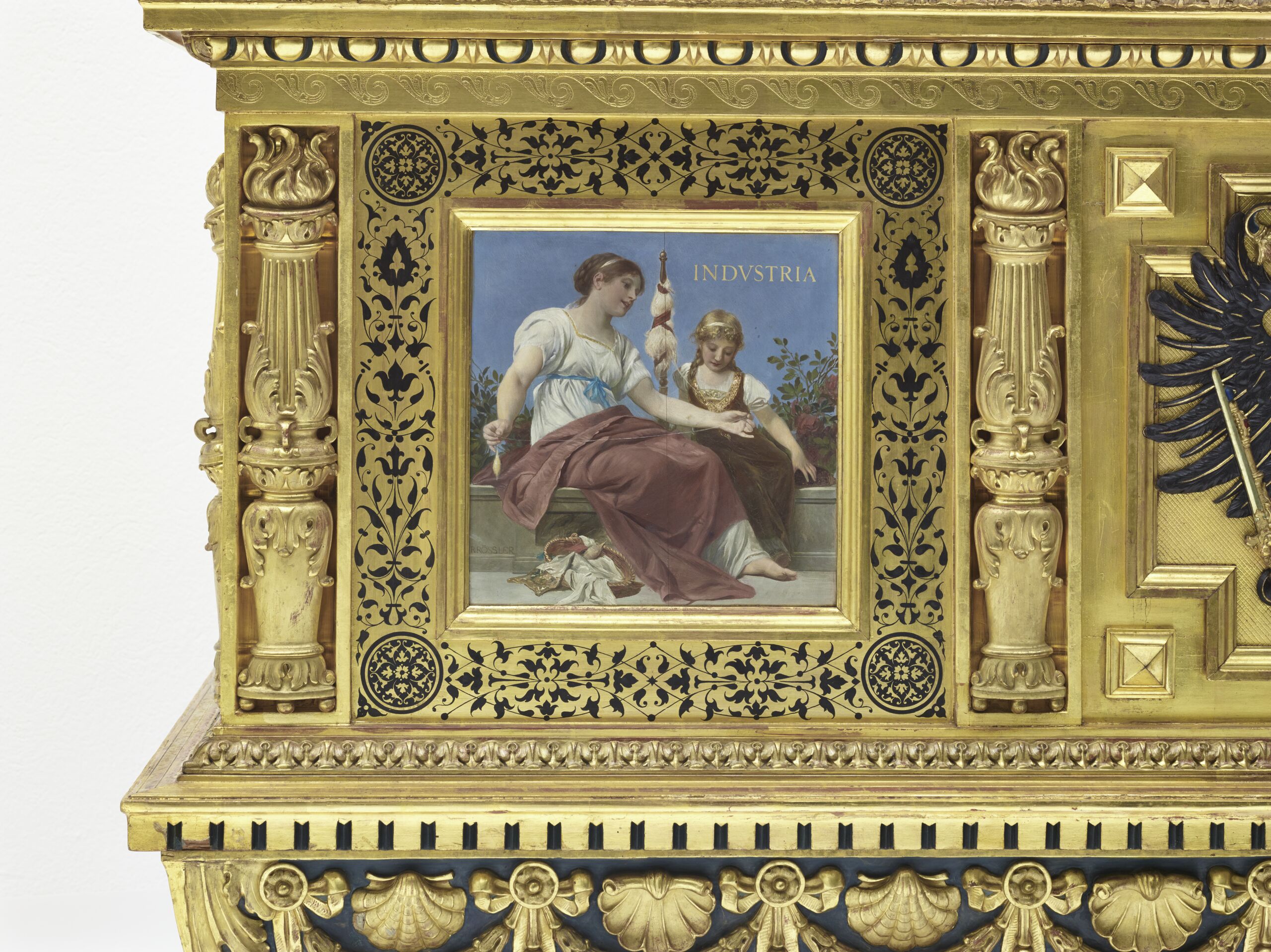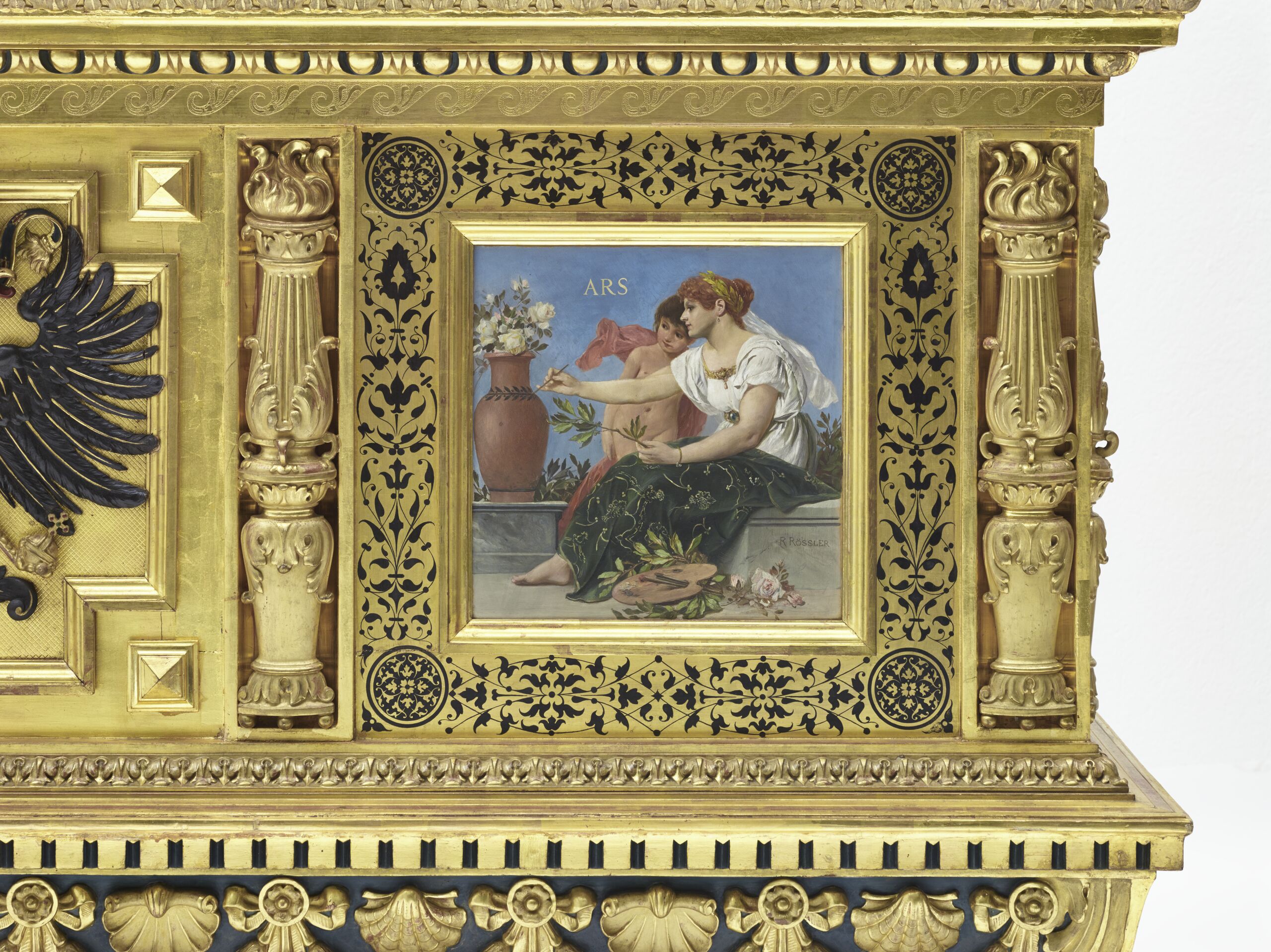 According to the inscription on its lid, this chest designed by Hermann Herdtle was made for the Imperial Royal Austrian Museum of Art and Industry, today’s MAK. The central front panel is decorated by a carved state coat of arms upon the imperial double-eagle; the two other panels contain allegories of art and industry painted in oil by Rudolf Rössler (1864–1954), who—like Herdtle—was a professor at the Vienna School of Arts and Crafts. The models for this magnificent piece of Historicist furniture were hope or dowry chests from the Renaissance; these are echoed in this piece’s lavish Renaissance-style carvings, while the front panels are framed by Moorish ornaments.