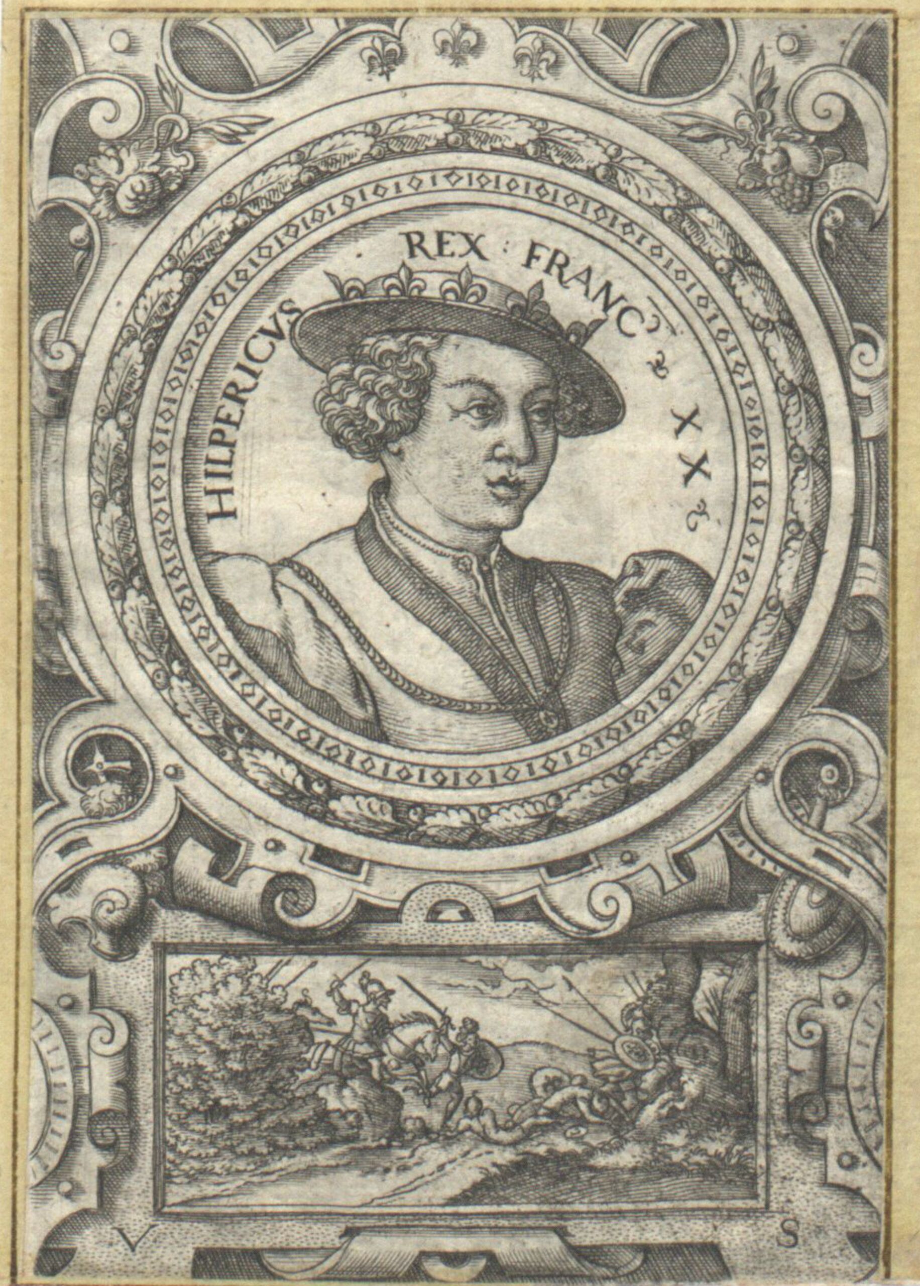 - Chilperich II., auf der Rückseite Theoderich II., Blatt aus der Folge der französischen Könige mit dem Titel „Effigies Regum Francorum Omnium etc.“, beidseitig bedruckt (given title)