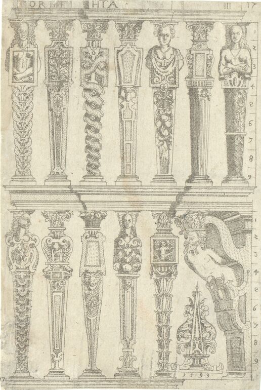 Blatt 18, seitenverkehrte Kopie für Johan Bussemacher in Köln durch einer unbekannte Radierer von der Originalausgabe von Gabriel Krammer, Architectura von den fünf Seulen sambt iren Ornamenten und Zierden…, Frankfurt am Main vor 1600 (Blätter tragen Daten wie 1598 und 1599), siehe Jervis 1974, S. 38-39, Nr. 243-260; Irmscher 1999, S. 135-144, Nr. 1.1; Fuhring 2004, 5372-5400.