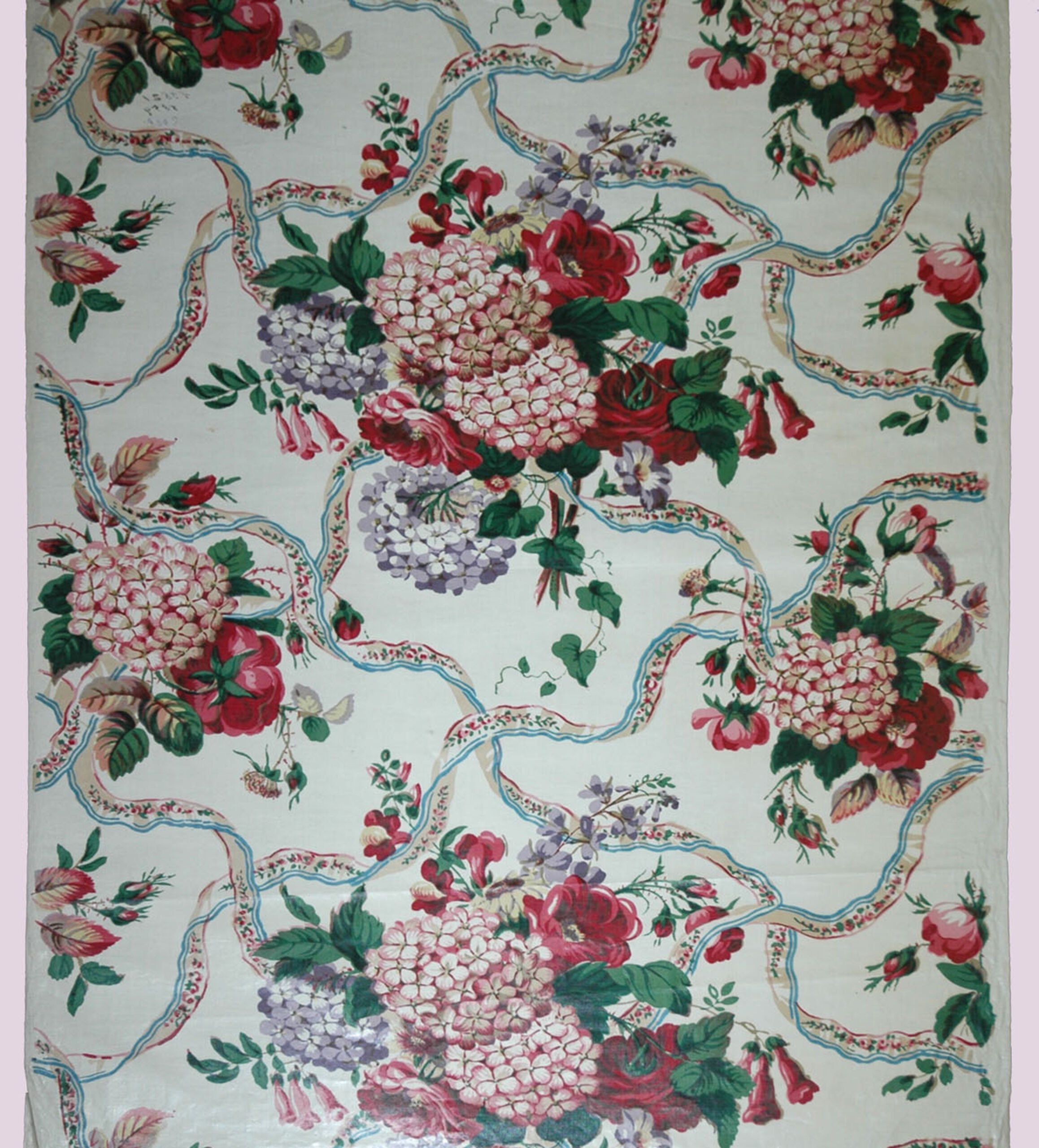 decorative fabric, Crossed- over blue and pink ribbons with large bunches of flowers (viburnum, roses) on white background, Green & Abbott, MAK Inv.nr. T 5854