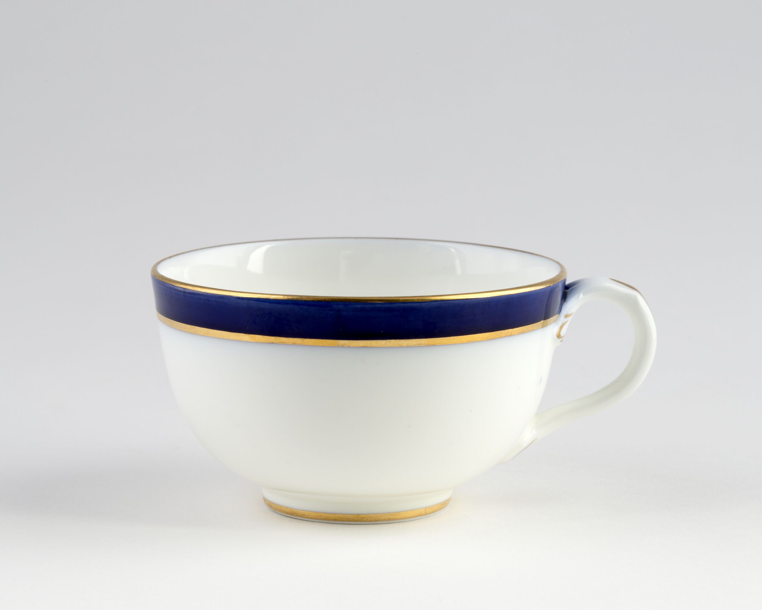 Tasse mit bauchiger Wandung mit breitem kobaltblauem Rand und Goldrändern sowie goldgehöhtem Ohrenhenkel mit goldgehöhten Blattkonsolen