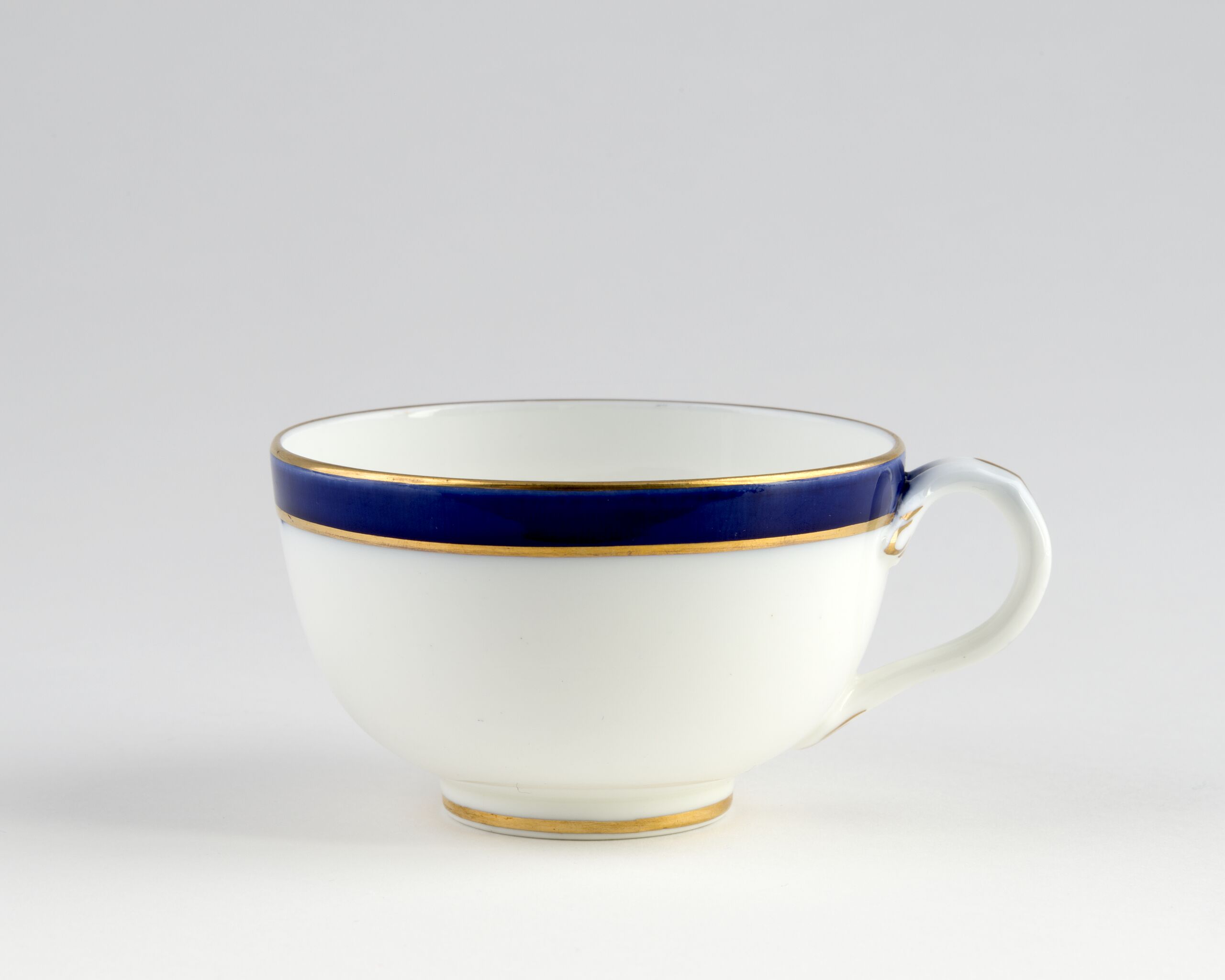 Tasse mit bauchiger Wandung mit breitem kobaltblauem Rand und Goldrändern sowie goldgehöhtem Ohrenhenkel mit goldgehöhten Blattkonsolen