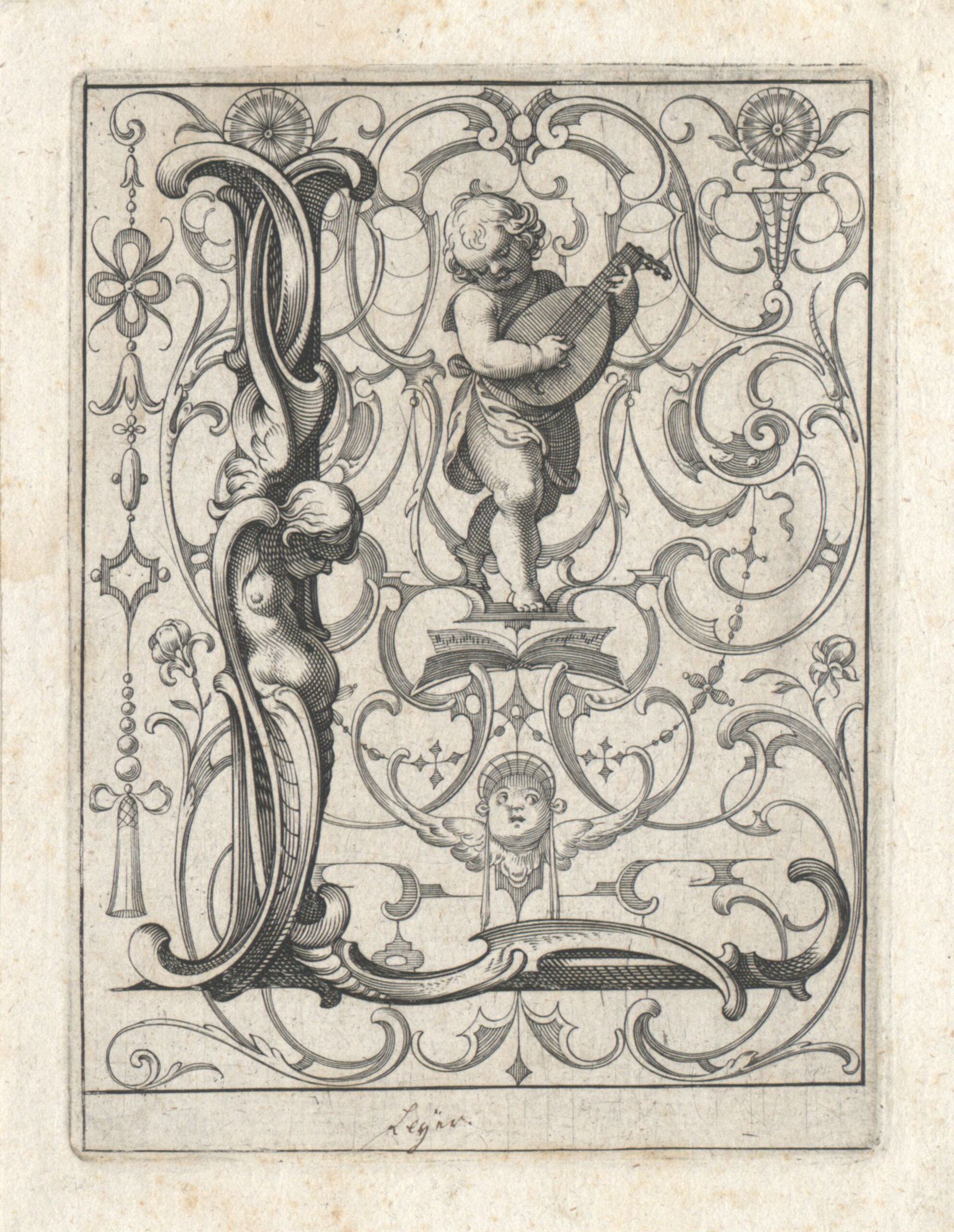 type specimens (documents), Der Buchstabe L mit einem Putto mit einer Laute, Blatt aus der Folge „Newes ABC Buechlein inventirt und in Kupffer gestochen von Luca Kilian Burger zu Augsburg”, gewidmet dem Goldschmied Melchior Gelb, Lucas Kilian, MAK Inv.nr. KI 1-161-12