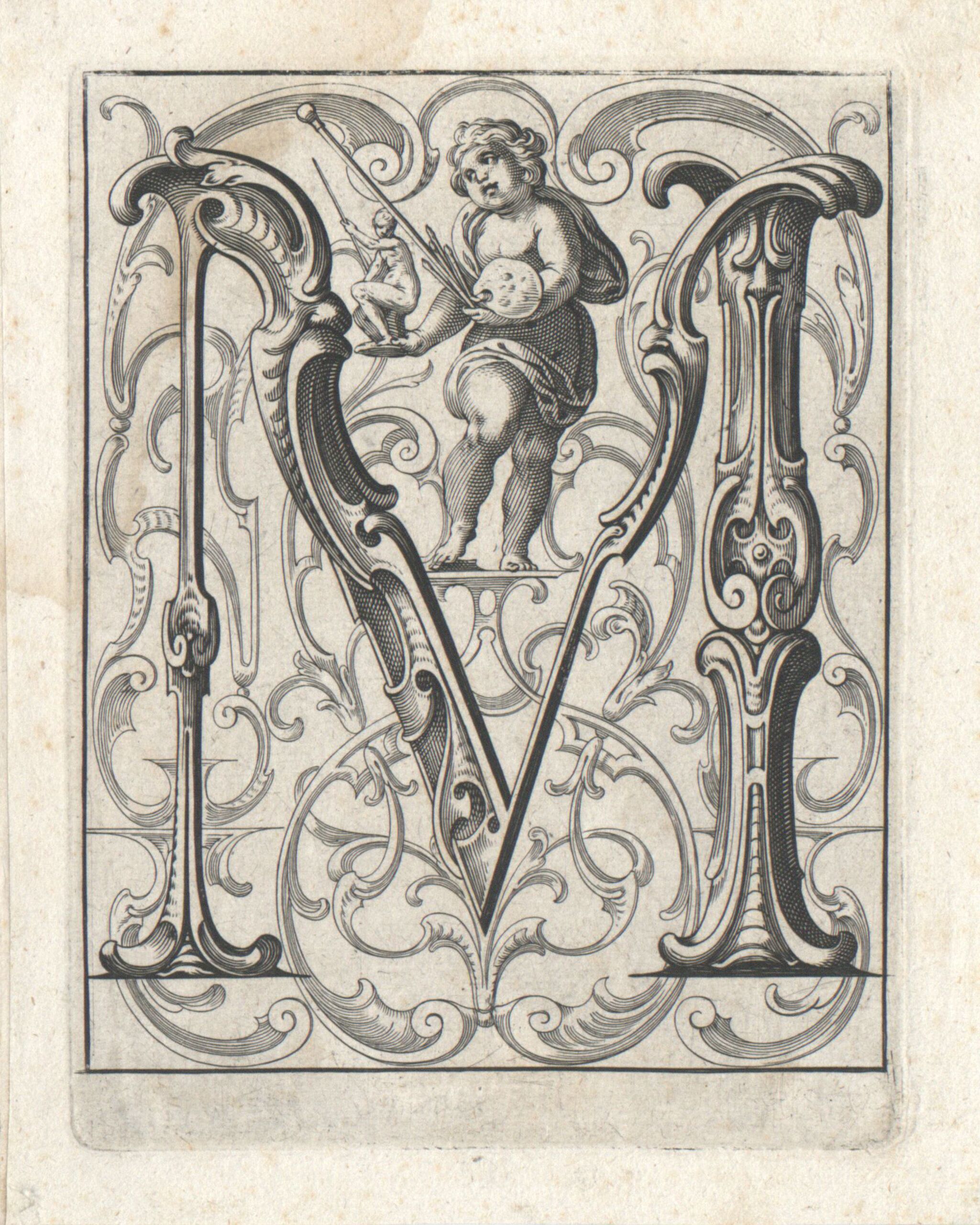 type specimens (documents), Der Buchstabe M mit einem Putto als Maler, Blatt aus der Folge „Newes ABC Buechlein inventirt und in Kupffer gestochen von Luca Kilian Burger zu Augsburg”, gewidmet dem Goldschmied Melchior Gelb, Lucas Kilian, MAK Inv.nr. KI 1-161-13
