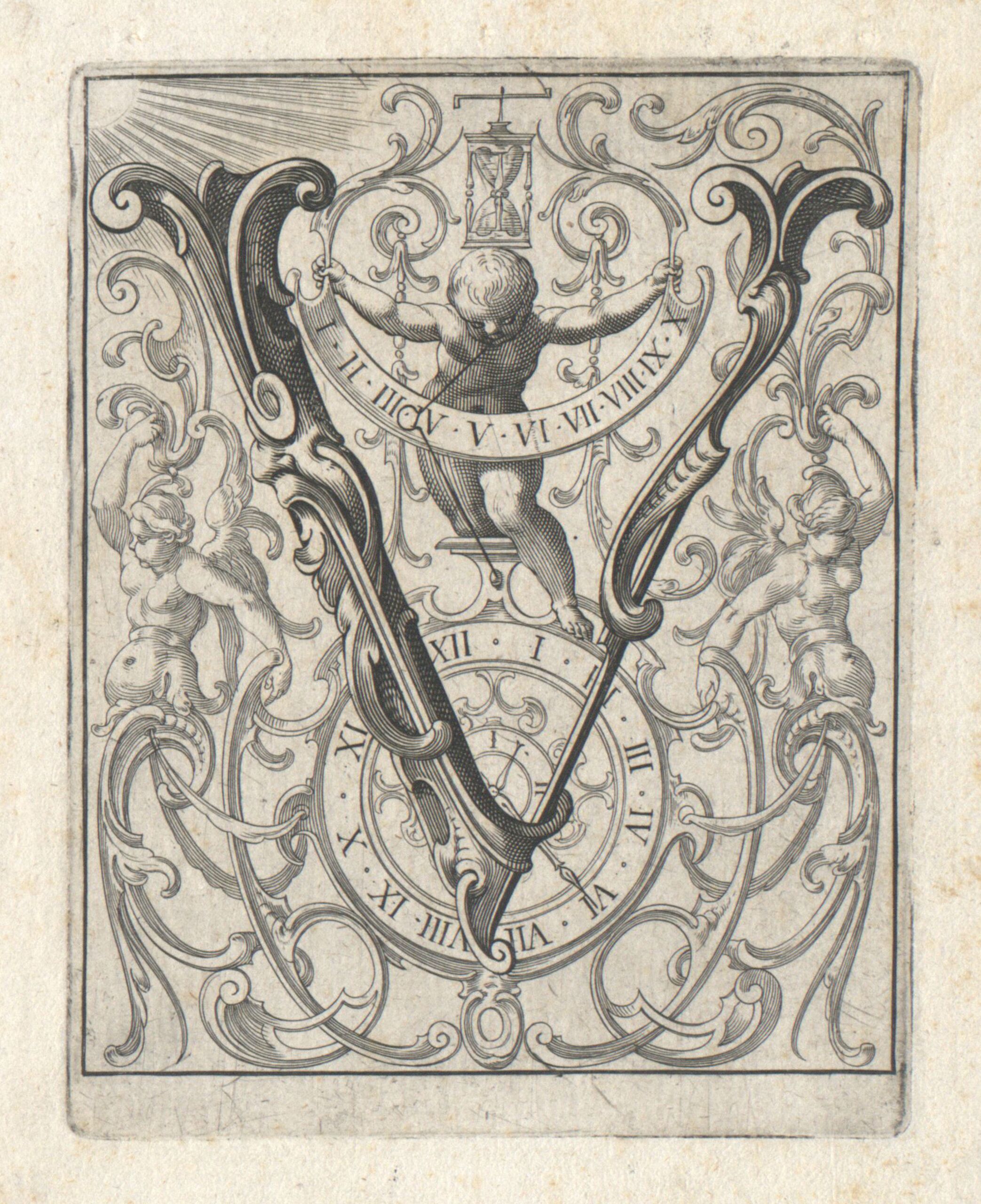 type specimens (documents), Der Buchstabe V mit einem Putto und zwei Uhren die jeweils auf die Vier zeigen, Blatt aus der Folge „Newes ABC Buechlein inventirt und in Kupffer gestochen von Luca Kilian Burger zu Augsburg”, gewidmet dem Goldschmied Melchior Gelb, Lucas Kilian, MAK Inv.nr. KI 1-161-21