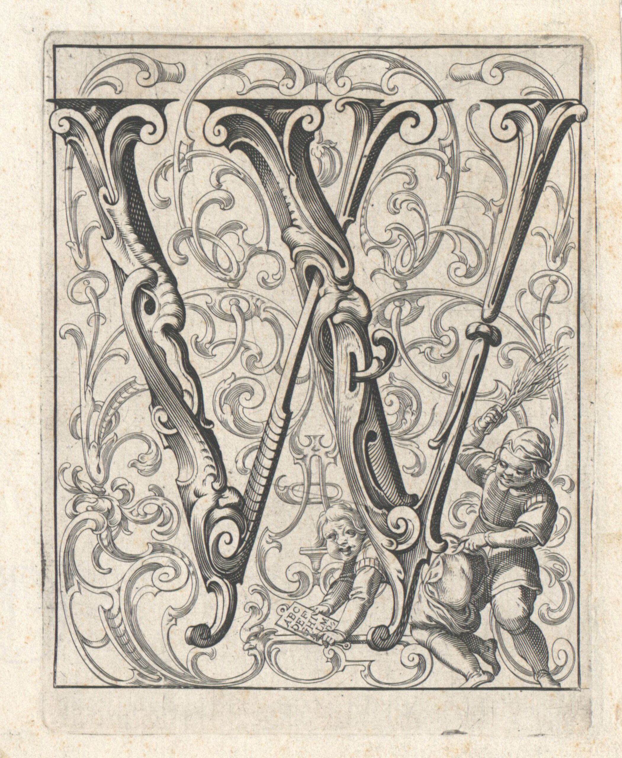type specimens (documents), Der Buchstabe W mit zwei Kindern, einer den anderen mit einer Rute schlagend, Blatt aus der Folge „Newes ABC Buechlein inventirt und in Kupffer gestochen von Luca Kilian Burger zu Augsburg”, gewidmet dem Goldschmied Melchior Gelb, Lucas Kilian, MAK Inv.nr. KI 1-161-22