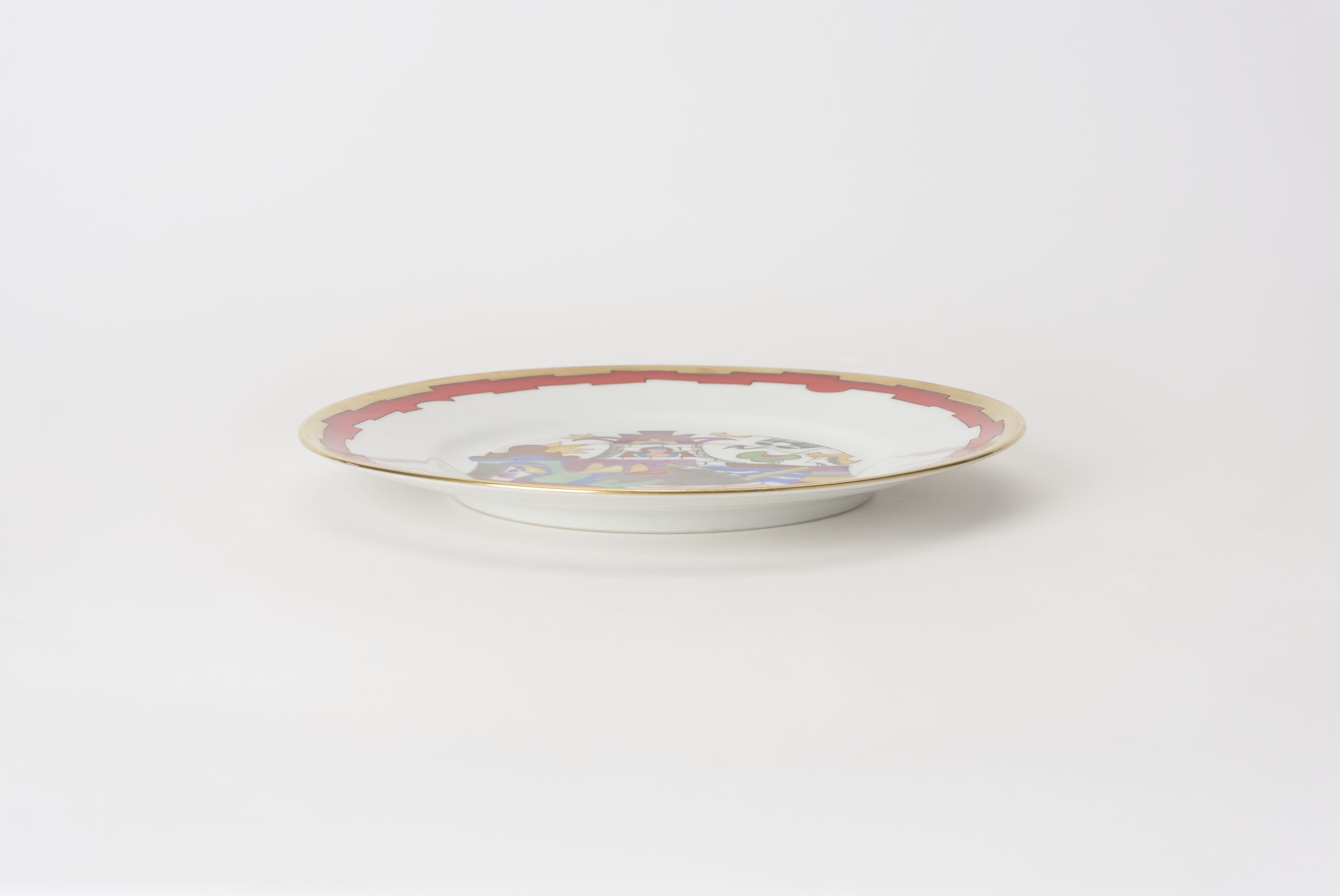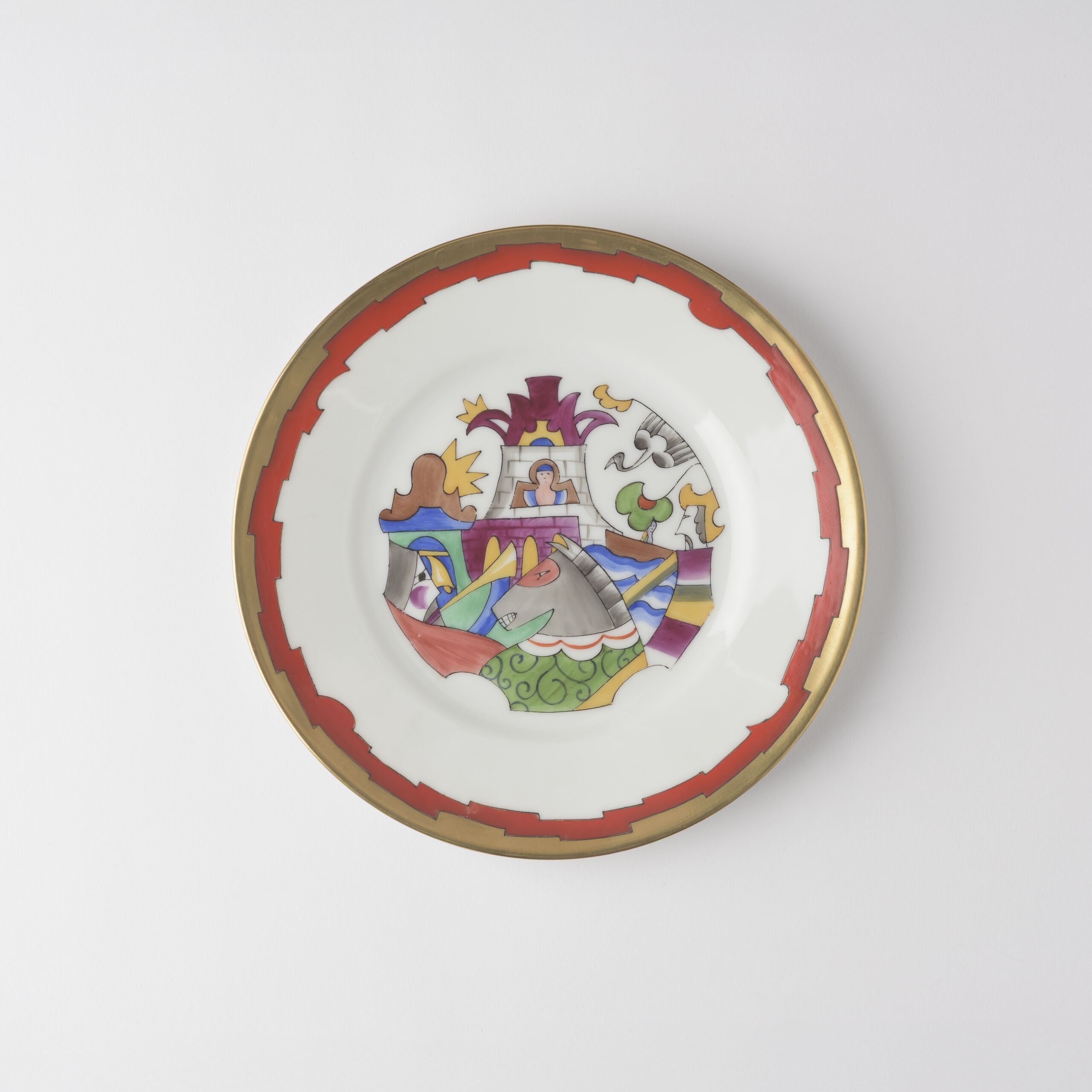 Dessertteller, Teeservice Kampfmotiv, Mehrtonig farbige Aufglasurbemalung in Gelb, Orange-Rot, Rose, Grün, Blau, Braun sowie Schwarz und Gold. Abstrakte szenische Darstellungen mit König, Rittern, Burgfrauen und Tieren in verschiedenartiger Landschaft
