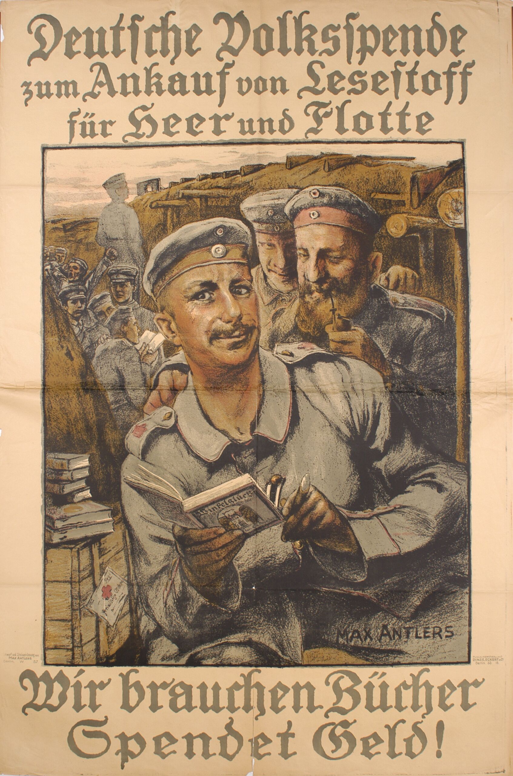 - 作品に記載されている文章: Deutsche Volksspende zum Ankauf von Lesestoff von Heer und Flotte. Wir brauchen Bücher. Spendet Geld