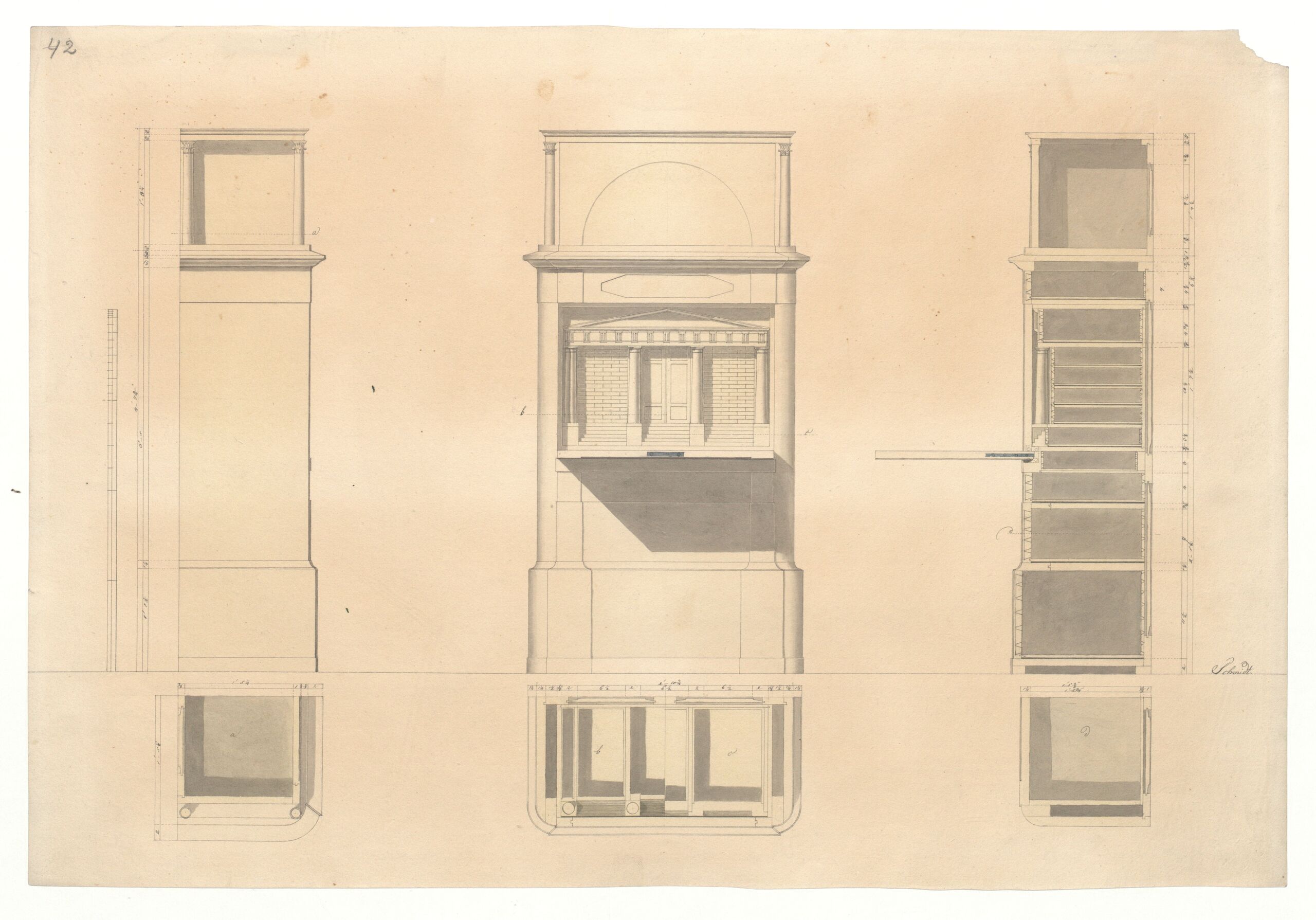 Seitenriß, Aufriß, Querschnitt und drei Grundrisse eines aufklappbaren Sekretärs auf profiliertem Sockel. Der Mittelteil dieses Sekretärs ist besonders architektonisch geprägt und zeigt eine dreigliedrige Fassade in dorischer Ordnung mit Stufen zu einem Portal sowie einem Triglyphenfries