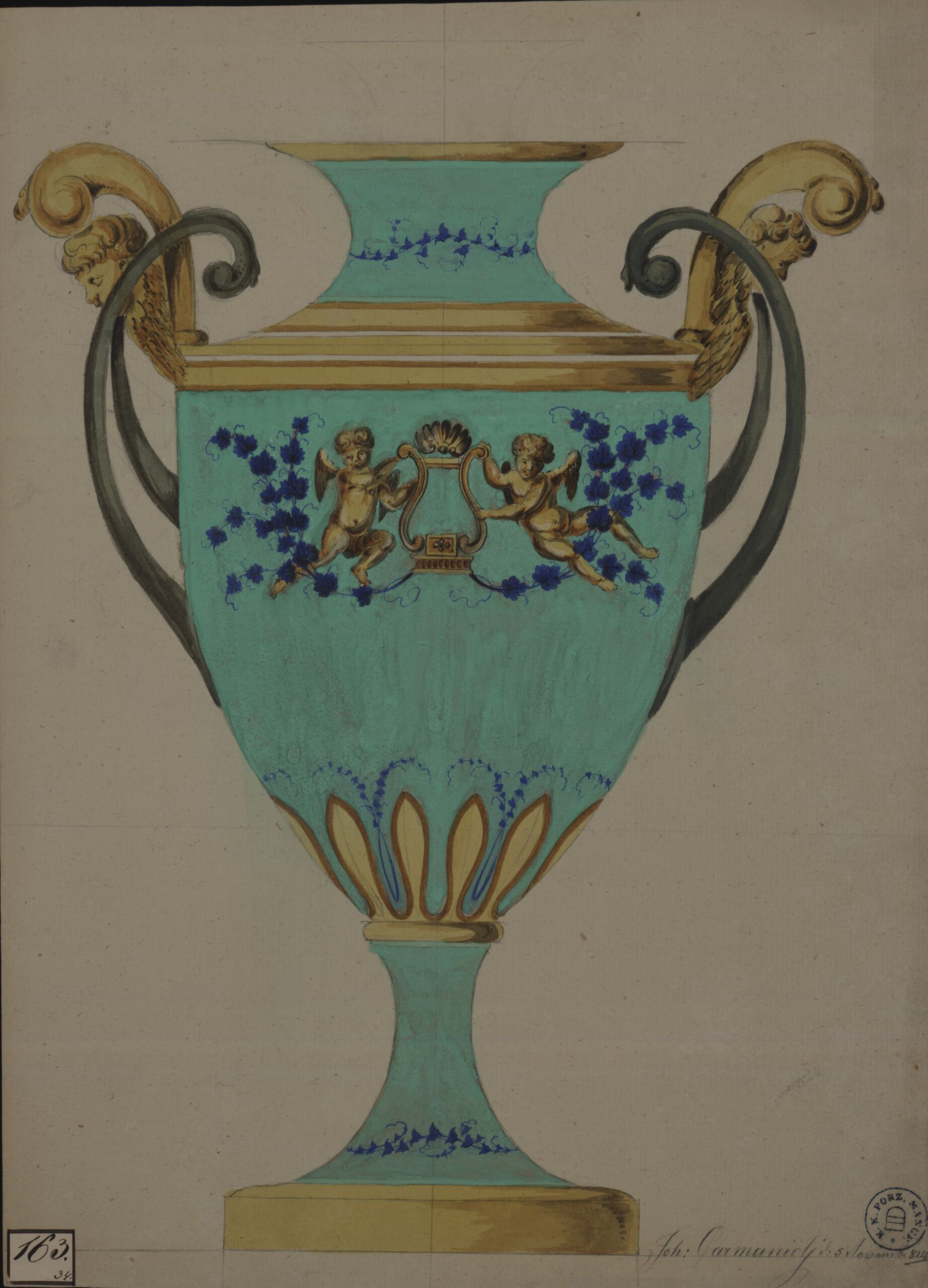 Vase auf Fuß mit zwei doppelten Henkeln, die aus geschwungenen Teilen und Maskarons mit Voluten gebildet werden; am Vasenkörper Putti, die eine Lyra halten und Blattwerk auf türkis Grund;
