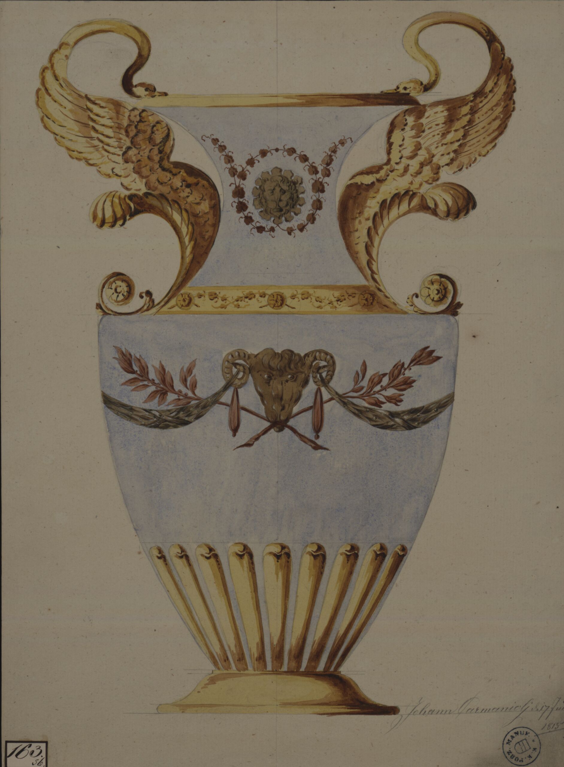 Vase mit zwei Henkeln, die aus Schwänen gebildet sind, am Vasenkörper Widderkopf, Blattwerk und Girlanden, am Hals Löwenkopf und Blattranken, hellblauer Grund;