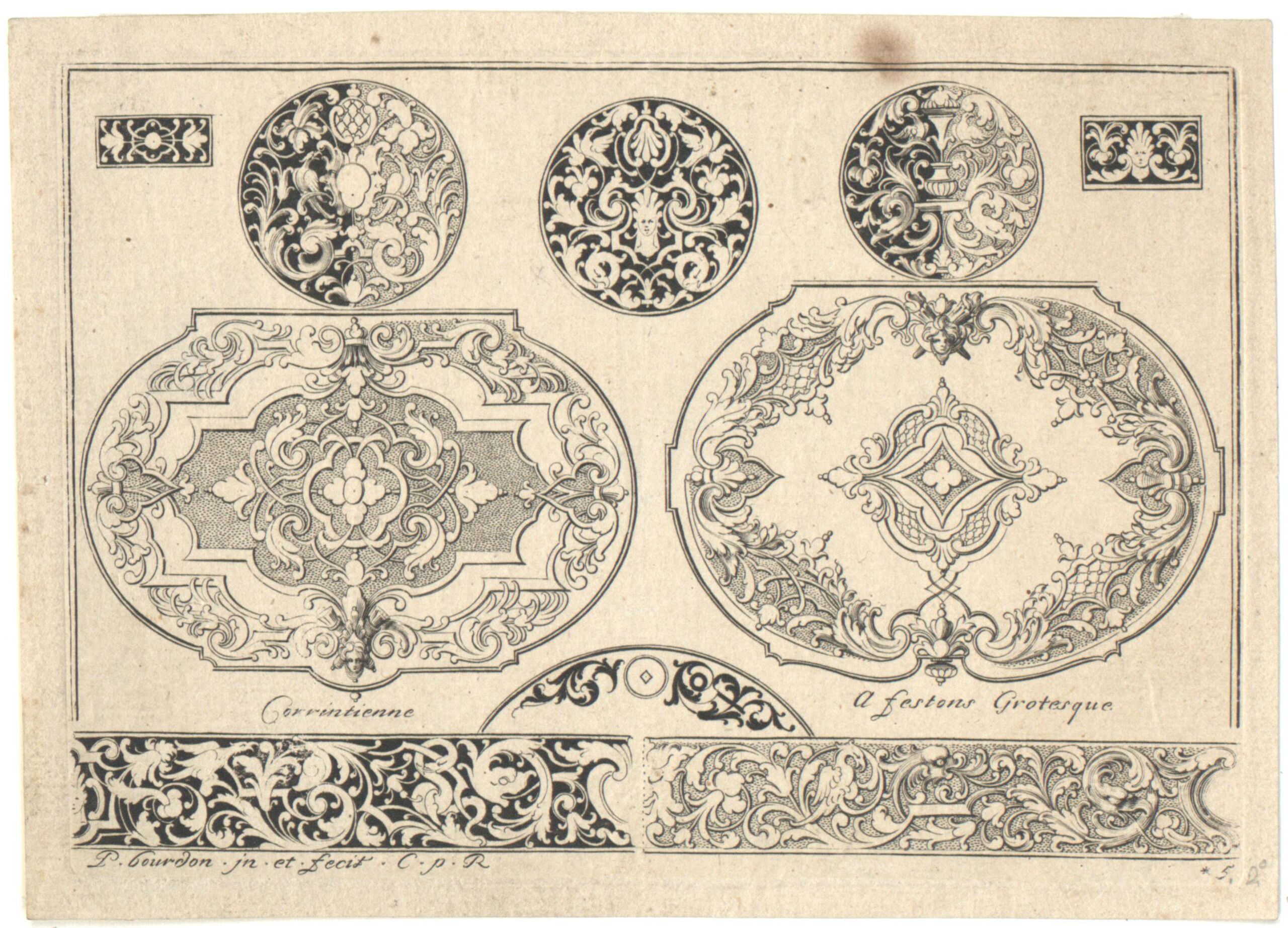 - 作品に記載されている文章: Corrintienne A festons Grotescque / P bourdon jn. et fecit Com p. Re / 5