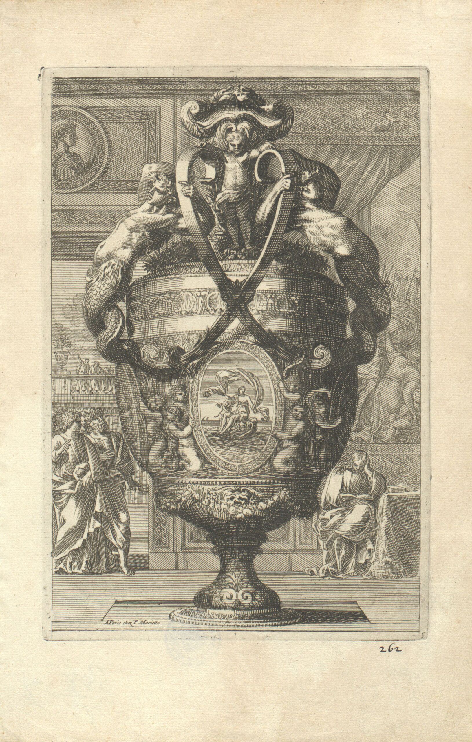 - Ein großes Gefäß, im Hintergrund eine figurale Darstellung, Blatt 5 aus der Folge „Vases A la moderne inventez et gravez par I. le Pautre“, herausgegeben von P. Mariette (given title)