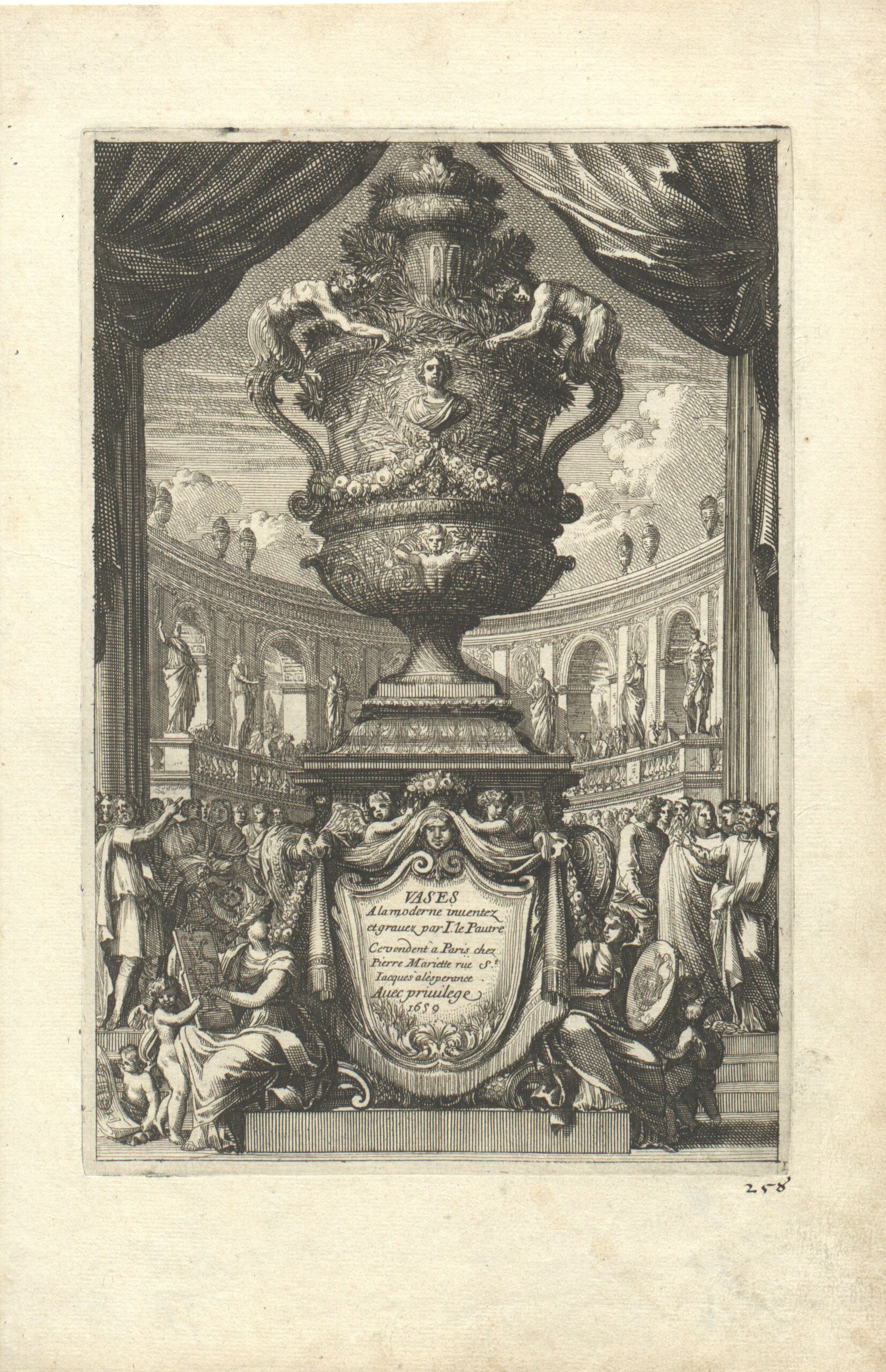 - Ein großes Gefäß, im Hintergrund eine figurale Darstellung, Titelblatt der Folge „Vases A la moderne inventez et gravez par I. le Pautre“, herausgegeben von P. Mariette (given title)