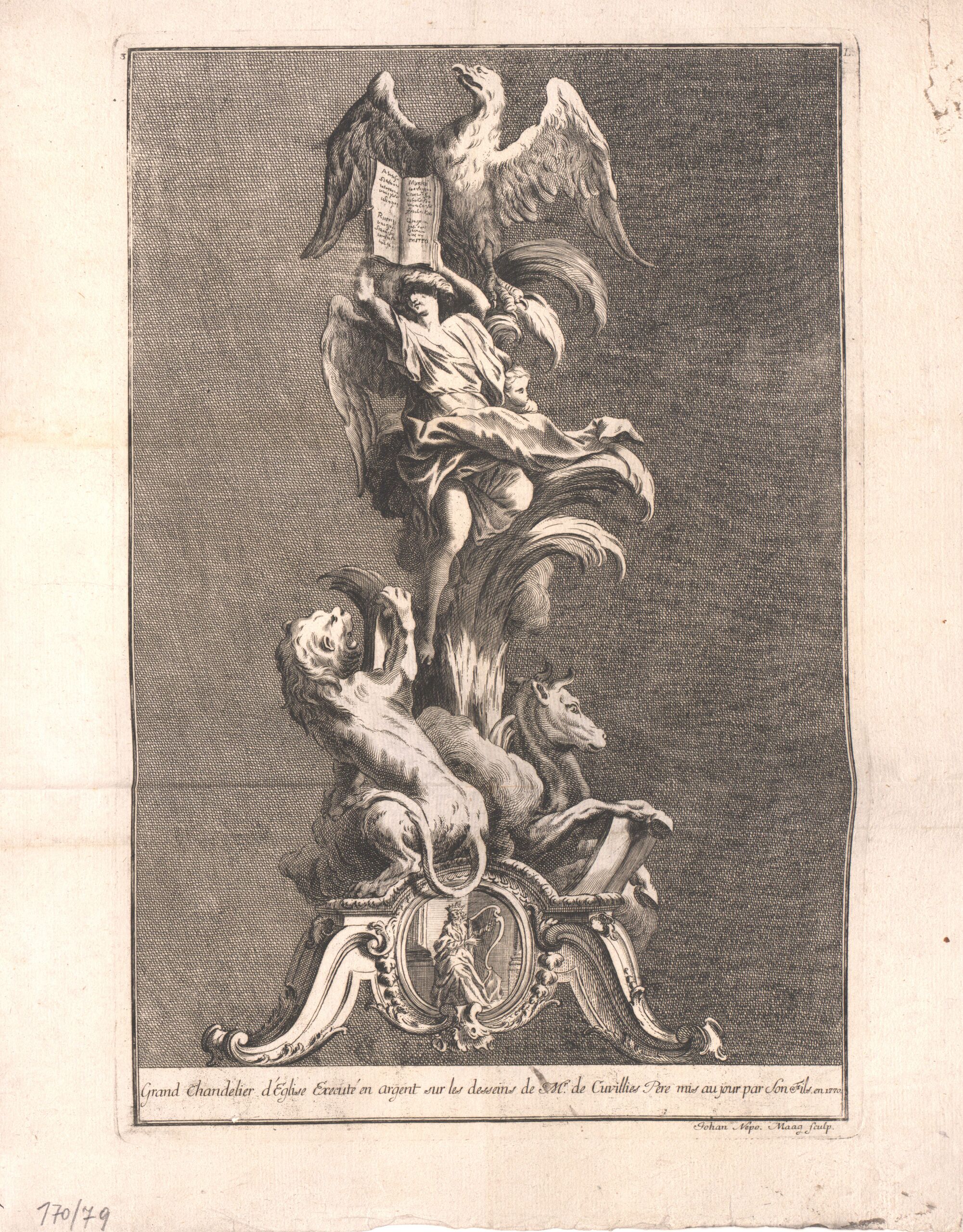 - 作品に記載されている文章: Grand Chandelier d‘ Eglise Executé en argent sur les desseins de M.r de Cuvillies Pere mis au jour par Son Fils en 1770 / Johann Nepo. Maag sculp. / L 3