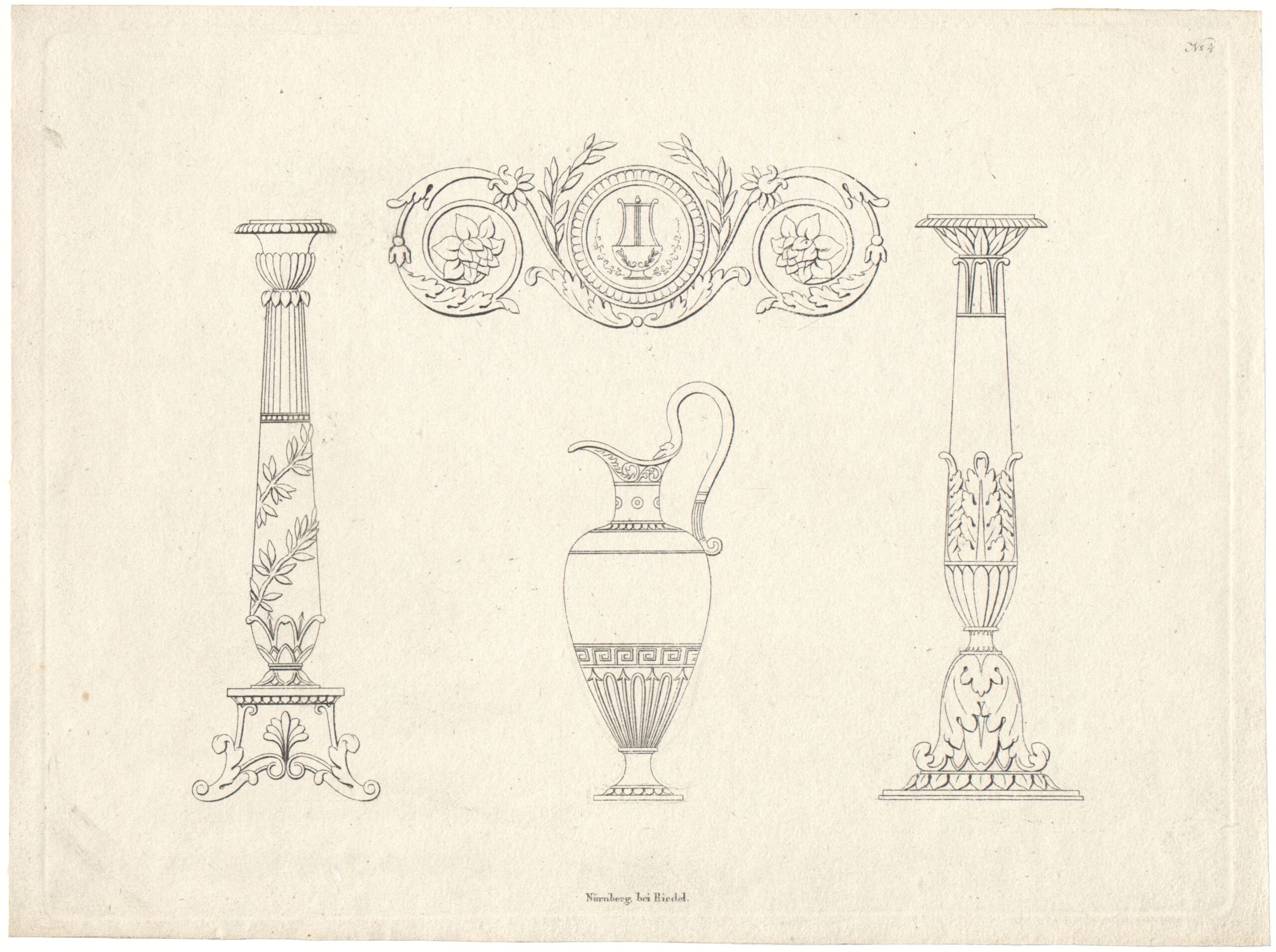 - Eine Vase und zwei Kerzenhalter, Blatt 4 aus einer Folge von Vorlagen für die Innenausstattung, herausgegeben von Riedel, in Heideloff´s Manier (given title)