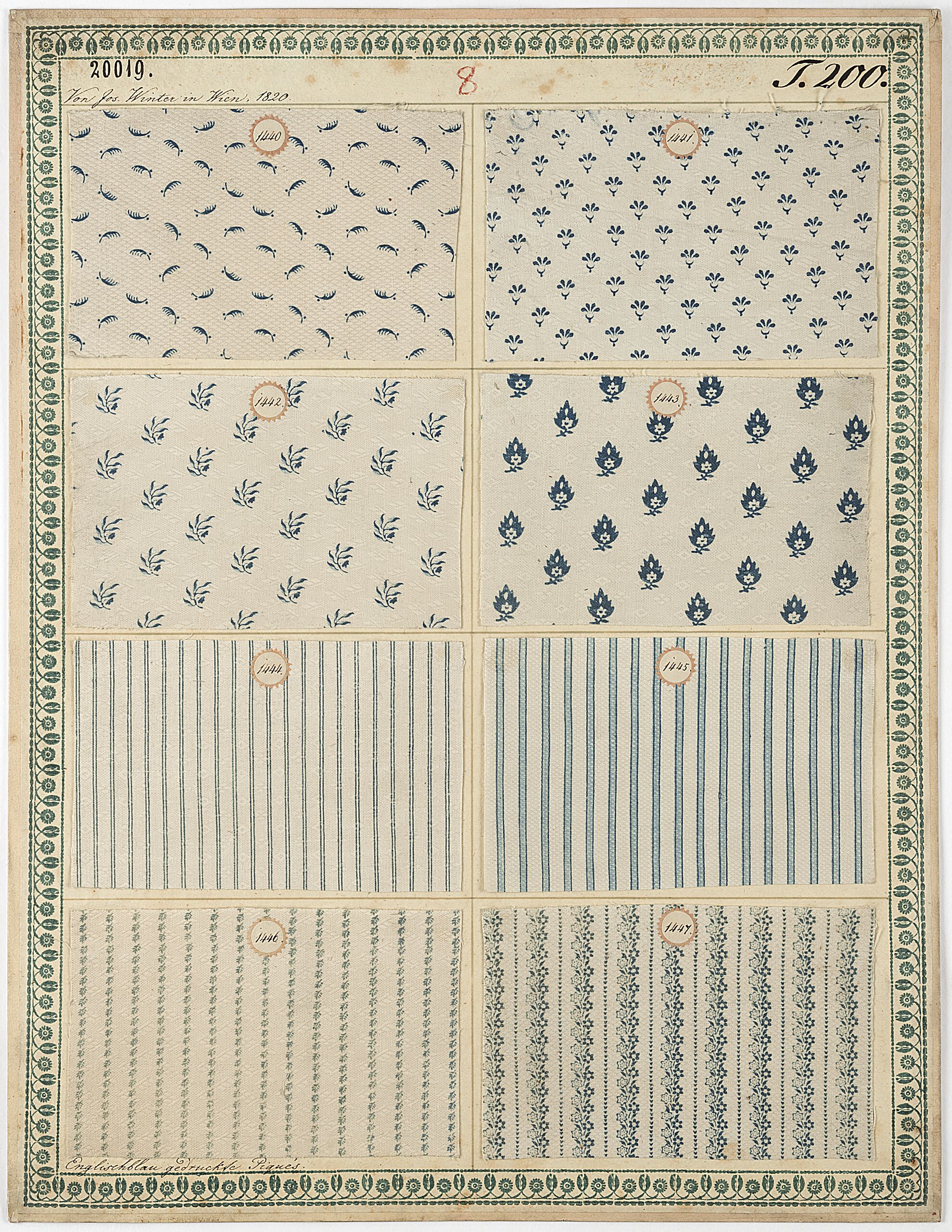swatch board, Englischblau gedruckte Piqués, Joseph Winter, MAK Inv.nr. TGM 20019