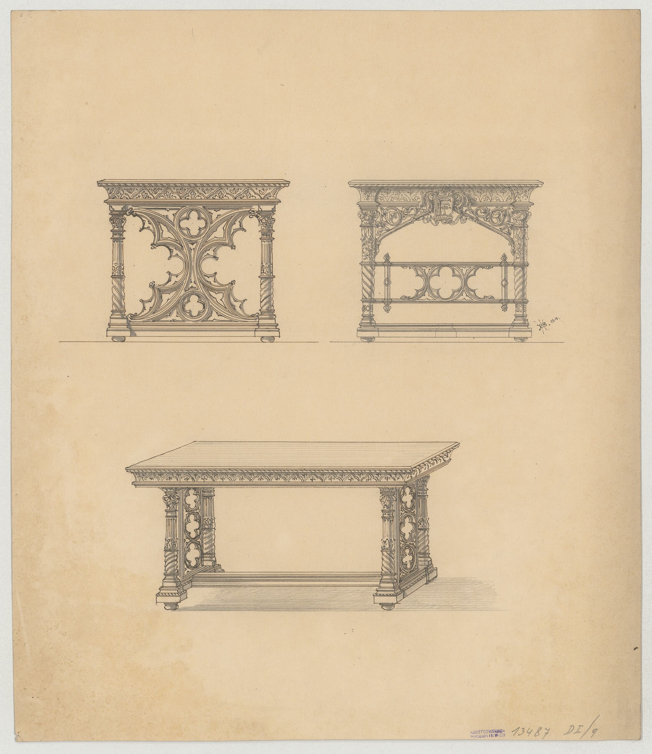 furniture design, Entwurf für drei Tische im neogotischen Stil mit reichem Maßwerkdekor, Heinrich Hof-Tapezierer Backé, MAK Inv.nr. KI 13487-4-1-9
