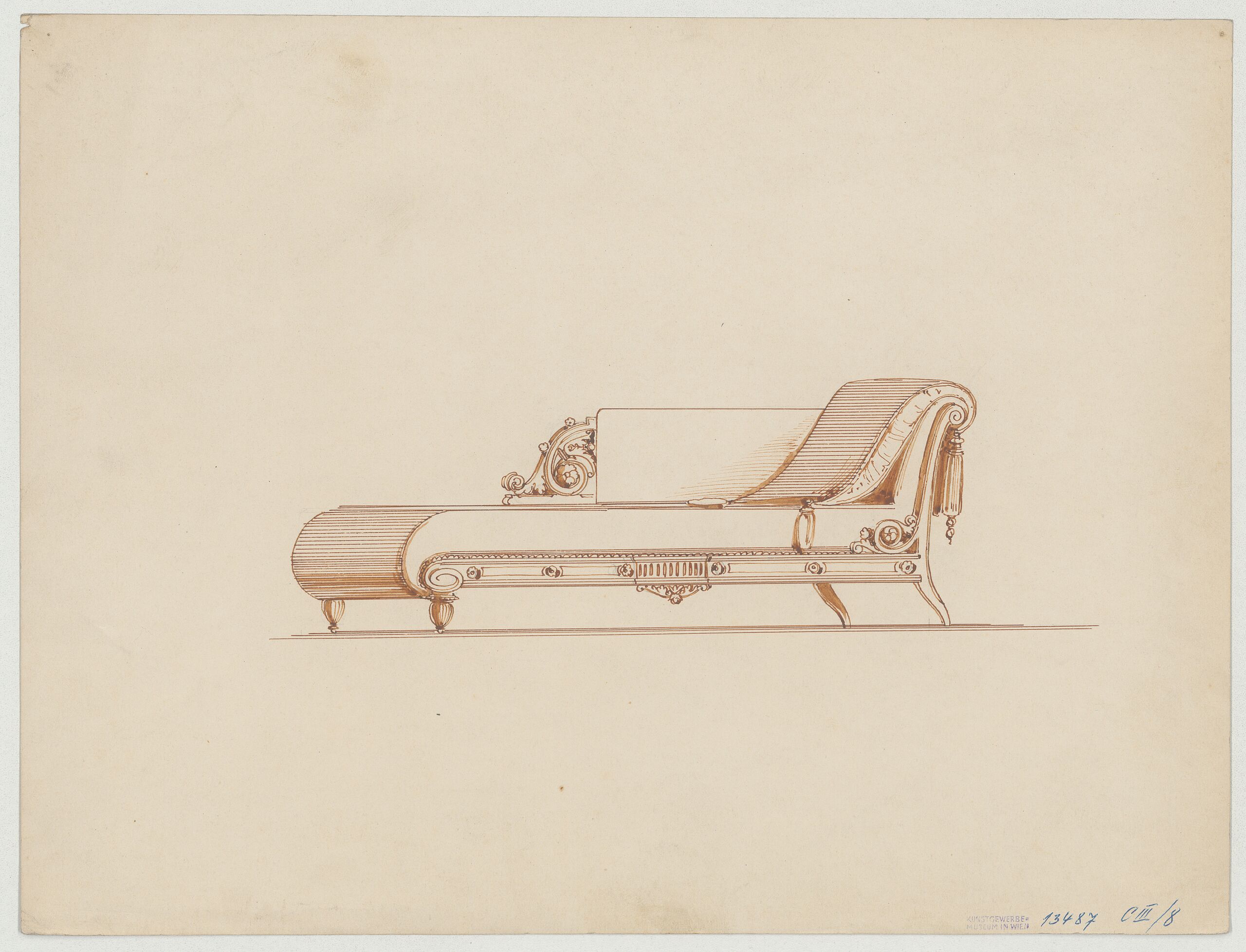 furniture design, Entwurf für ein Ruhebett im Stil der Neorenaissance mit antikisierenden Motiven in Form von Einrollungen, Akanthusranken sowie einem erweiterten Triglyphenmotiv und Rosetten zur Akzentuierung des Rahmens, Heinrich Hof-Tapezierer Backé, MAK Inv.nr. KI 13487-3-3-8