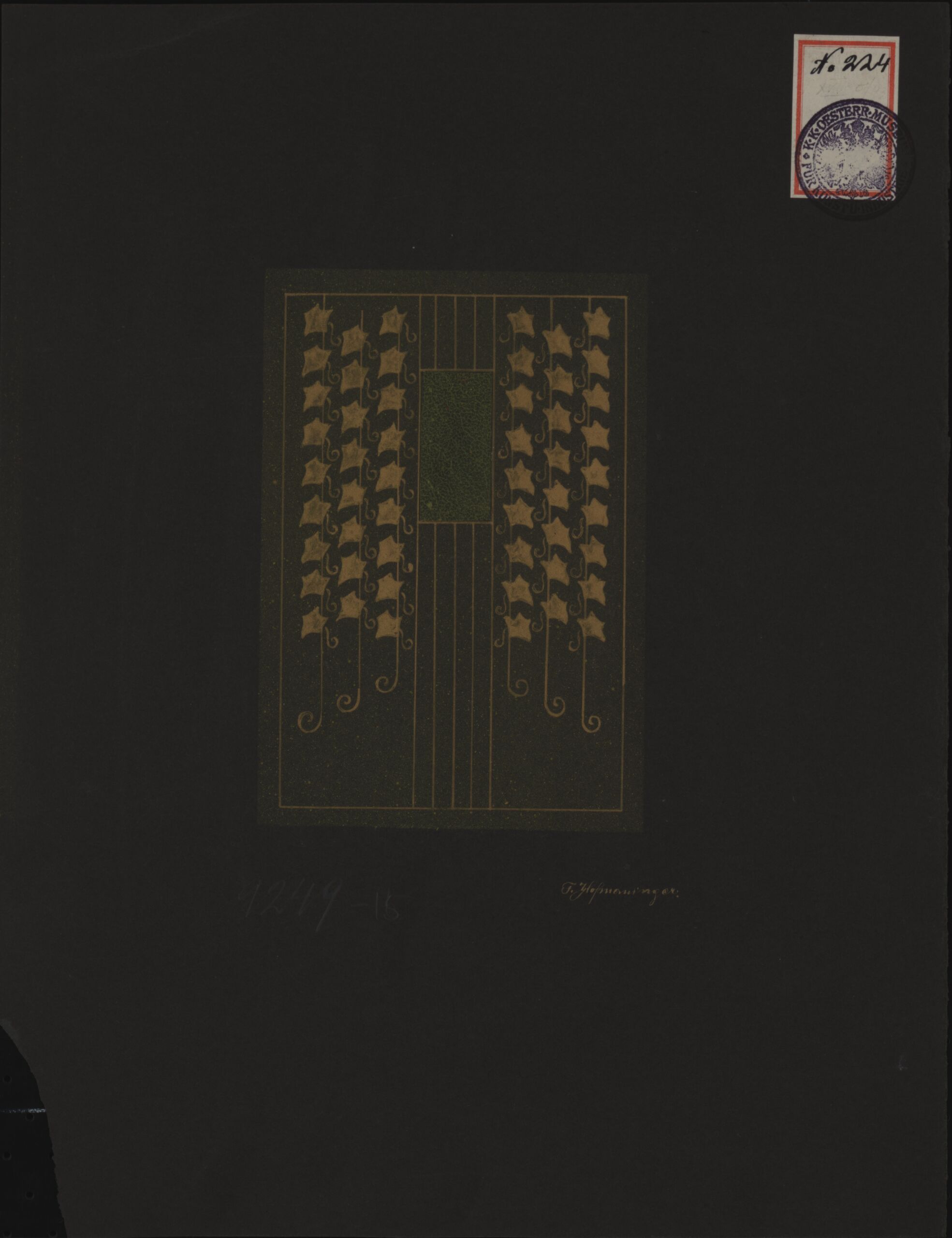 - stamp: Rot gerahmter Papieraufkleber mit N° 224 sowie Stempel des MAK
